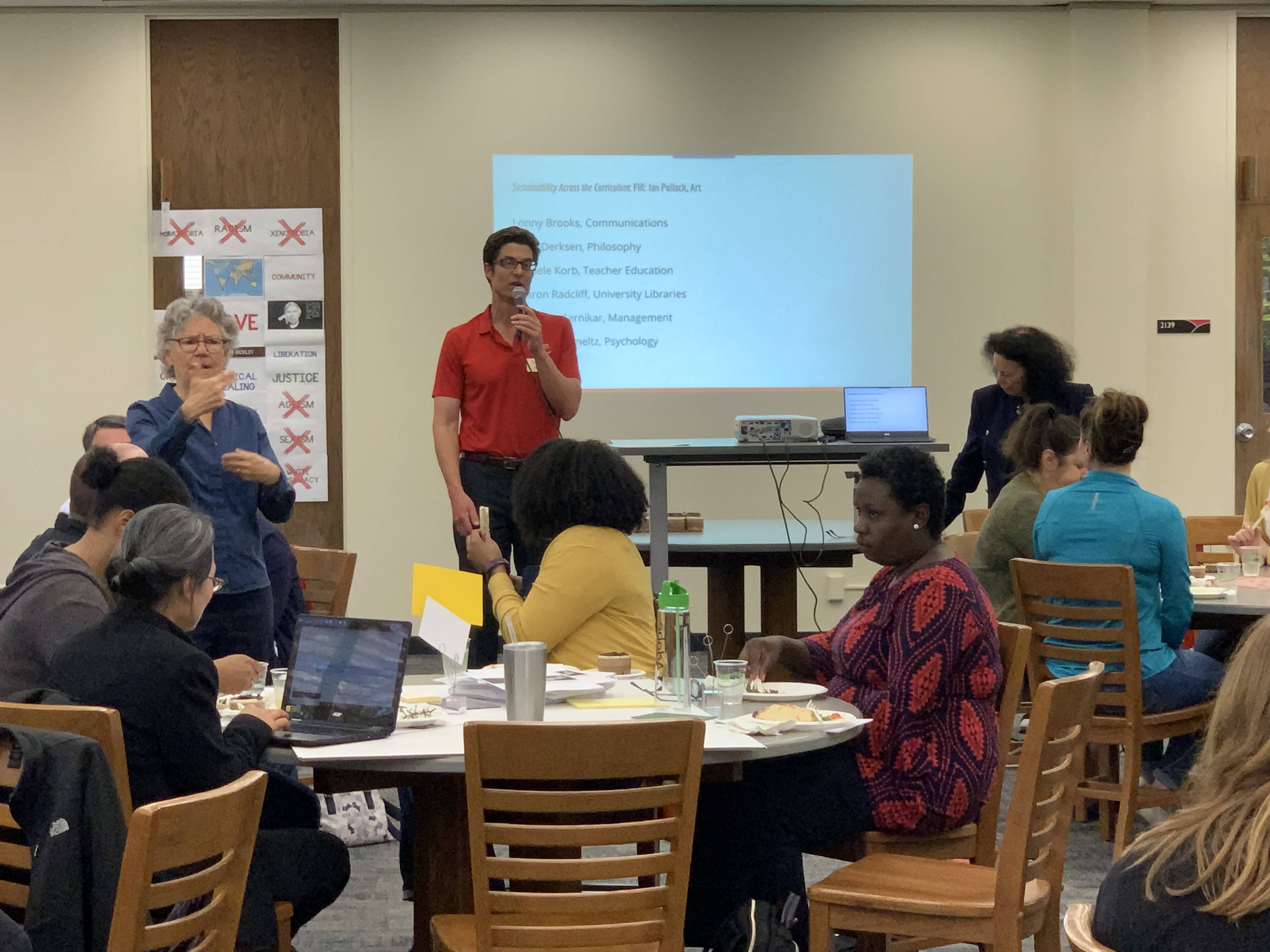 John Wenzler, Dean of University Libraries, summarizing ALS/OER efforts on campus and resources available for faculty interested in redesigning courses during the May '19 Spring Celebration of Teaching held in collaboration with the Library, the Online Campus, and the Office of Faculty Development/Faculty Center for Excellence in Teaching.
