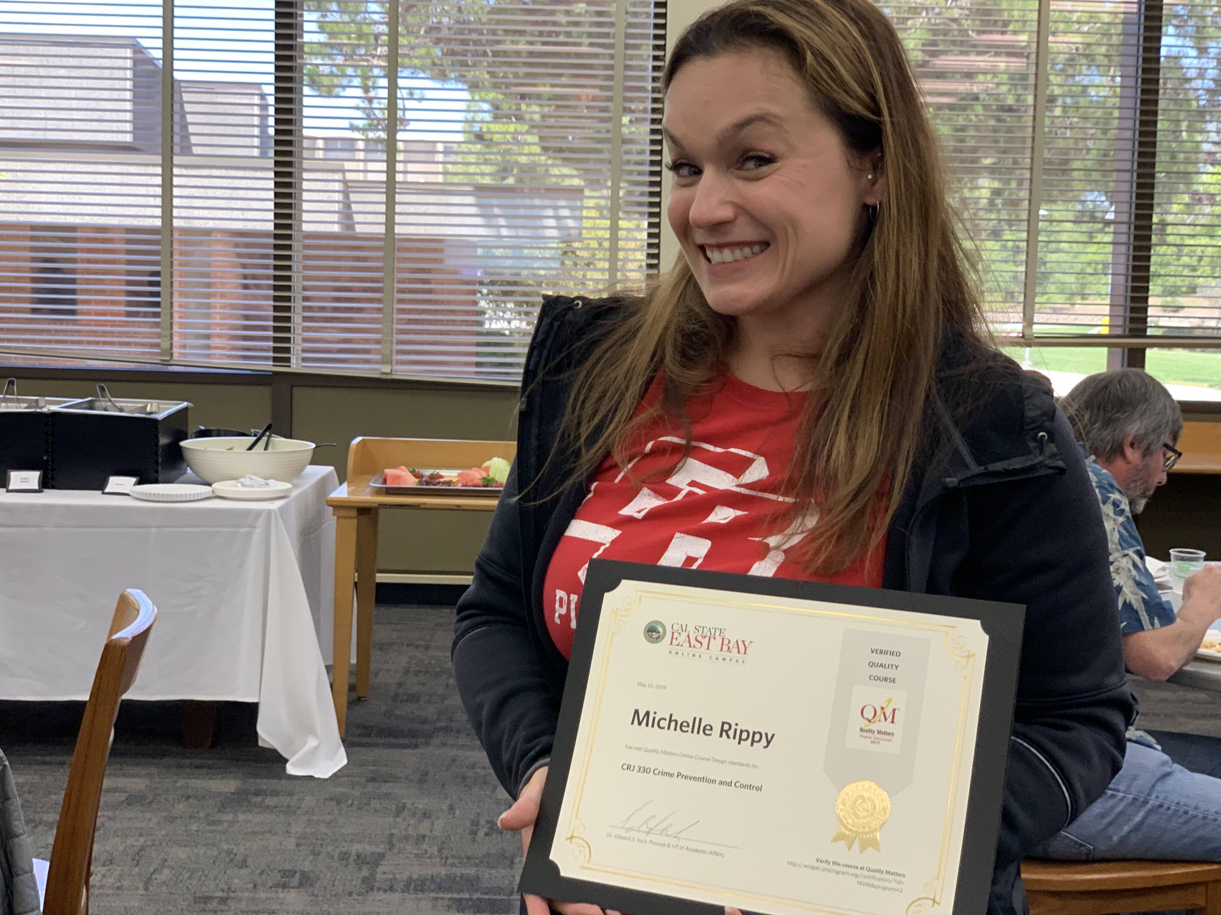 Michelle Rippy, CRJA, shares here QM certificate, awards at the Spring Celebration of Teaching, May 2019, an event with over 70 attendees open to the campus community.