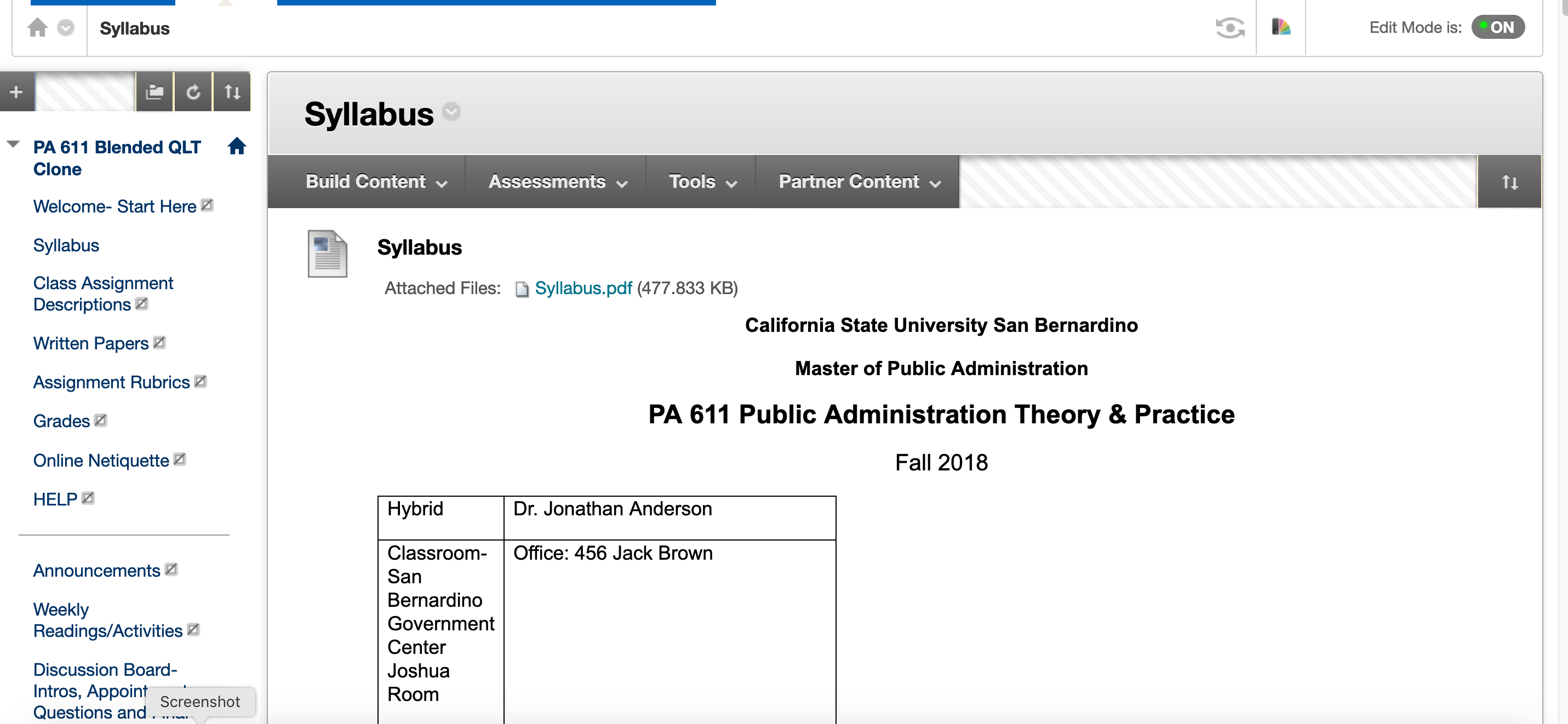 PA 611 Public Administration Theory & Practice taught by Dr. Jonathan Anderson in hybrid format received QLT certification.