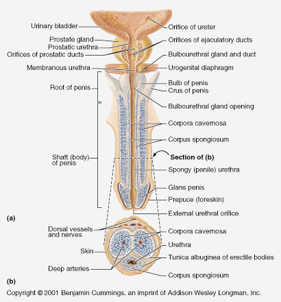 6. Urethra (in corpus spongiosum) - Passes trough penis (Dual role-reproductive and urinary)