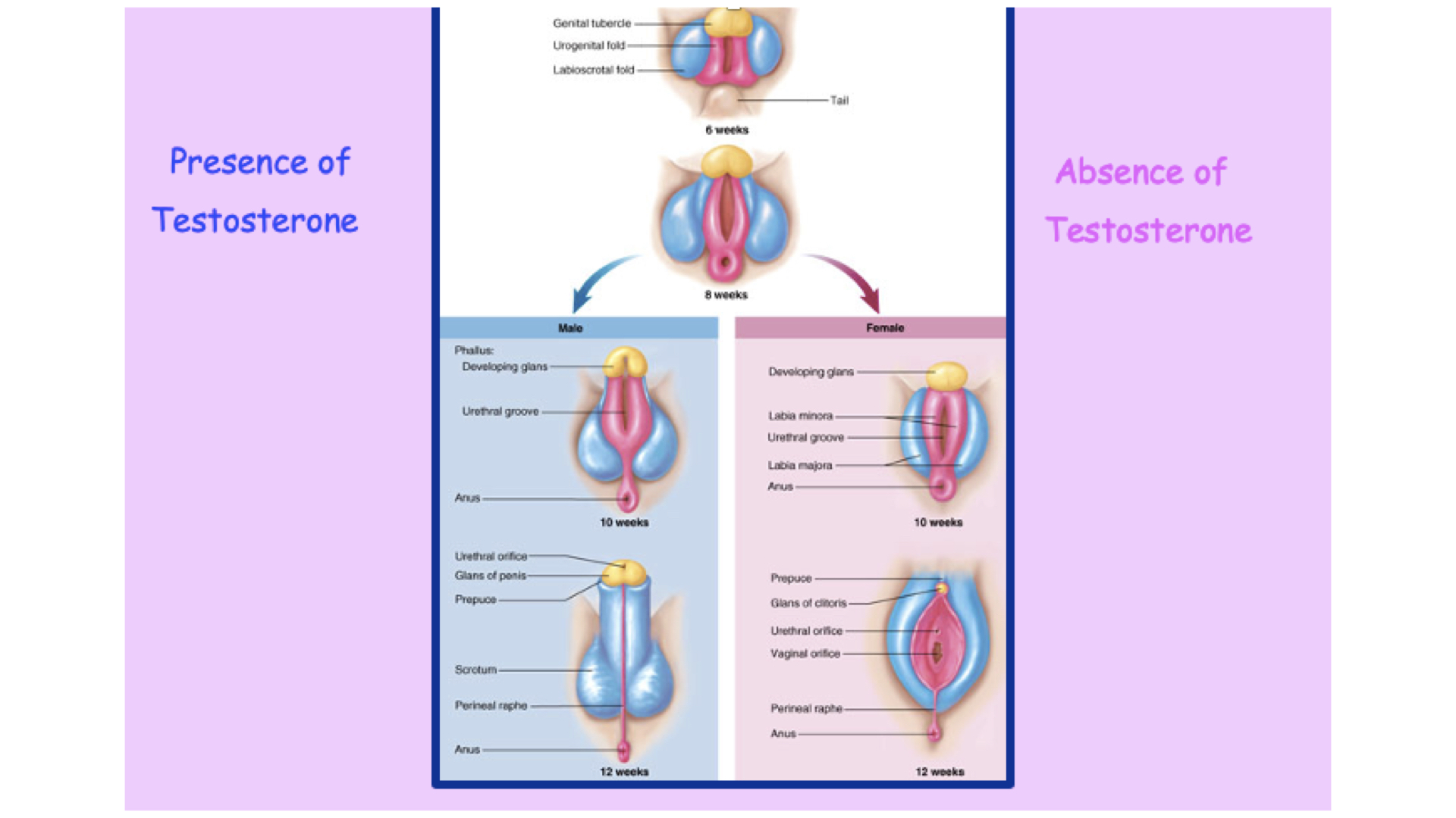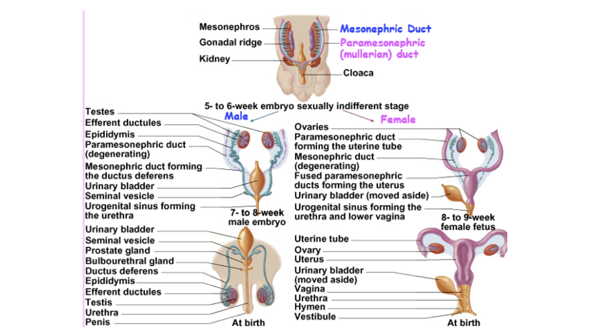 As the embryo begins to develop, male and female embryos are structurally identical. At five to six weeks two sets of ducts have developed--Mullerian and Wolffian. The Wolffian ducts are attached to to the metanephrose or primitive kidney. When testosterone begins to be secreted at about 7-8 weeks of development, this duct forms the epididymus, vas deferens, prostate, and the seminal vesicle. At this point the Mullerian ducts atrophy. The initiation of testosterone is directed by the SRY gene on the Y chromosome.