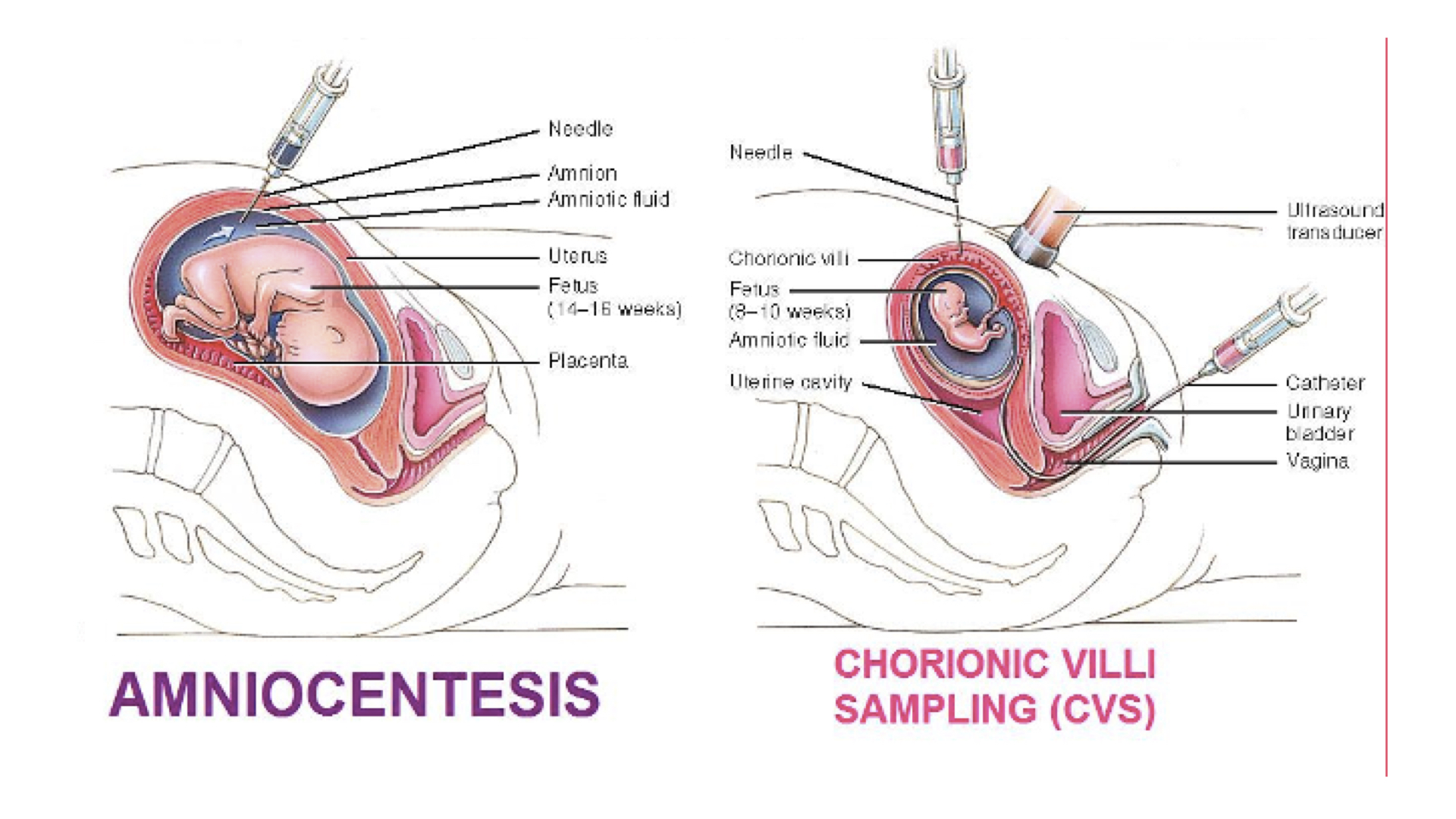 2. Chorionic Villi Sampling - This process has less risk as the needle only needs to go into the amnion to take sample and not all the way through into the fluid.