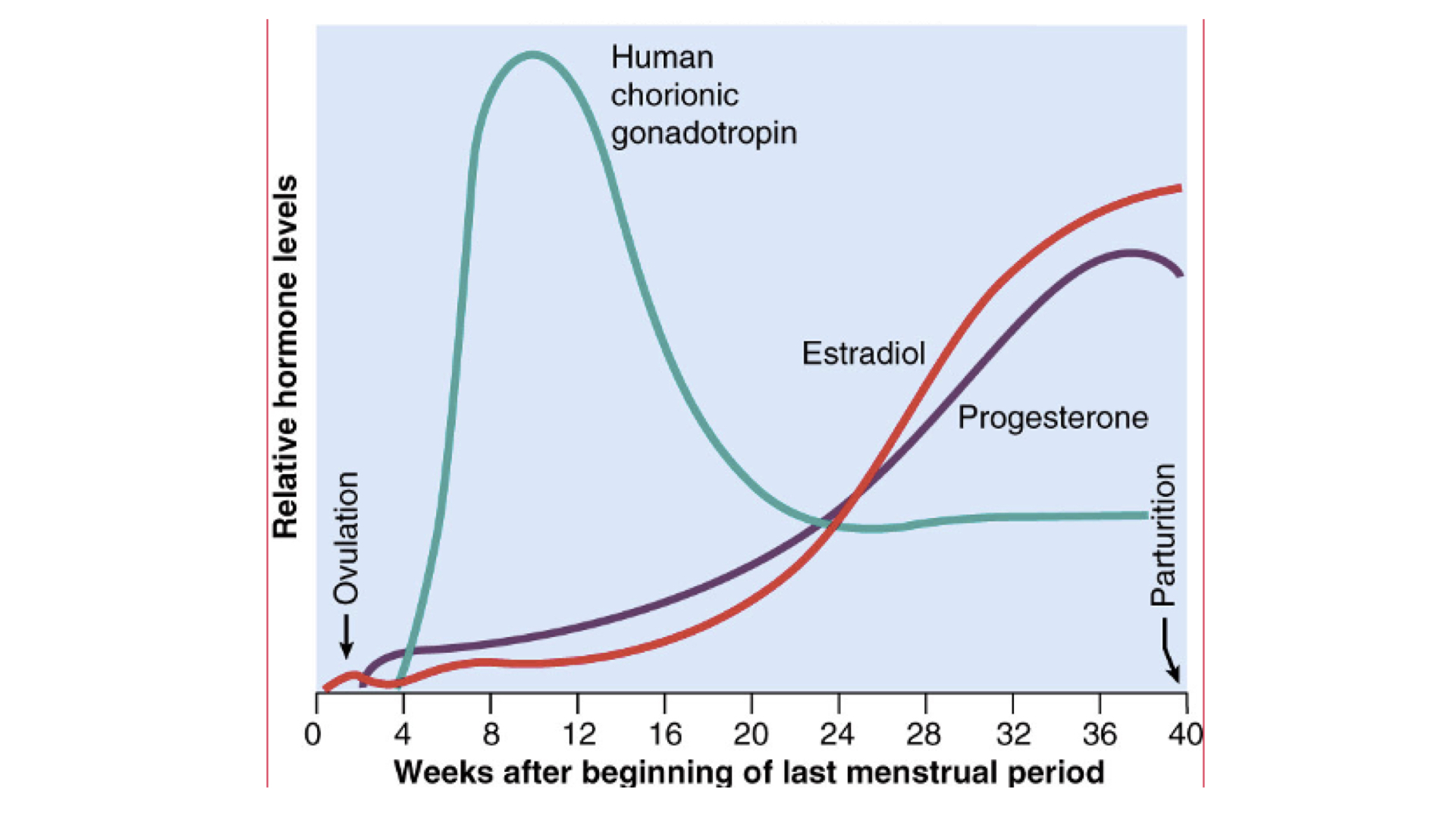 After the ovum begins to divide, it produces human chorionic gonadotropin (HCG). This maintains the corpus luteum and the progesterone it produces to maintain the endometrium. This is the hormone that causes a positive result in home pregnancy tests. High levels are produced; as a result, the kidneys filter out some of the hormone into the urine. Morning is best time to test because the hormone will have accumulated in the bladder overnight.