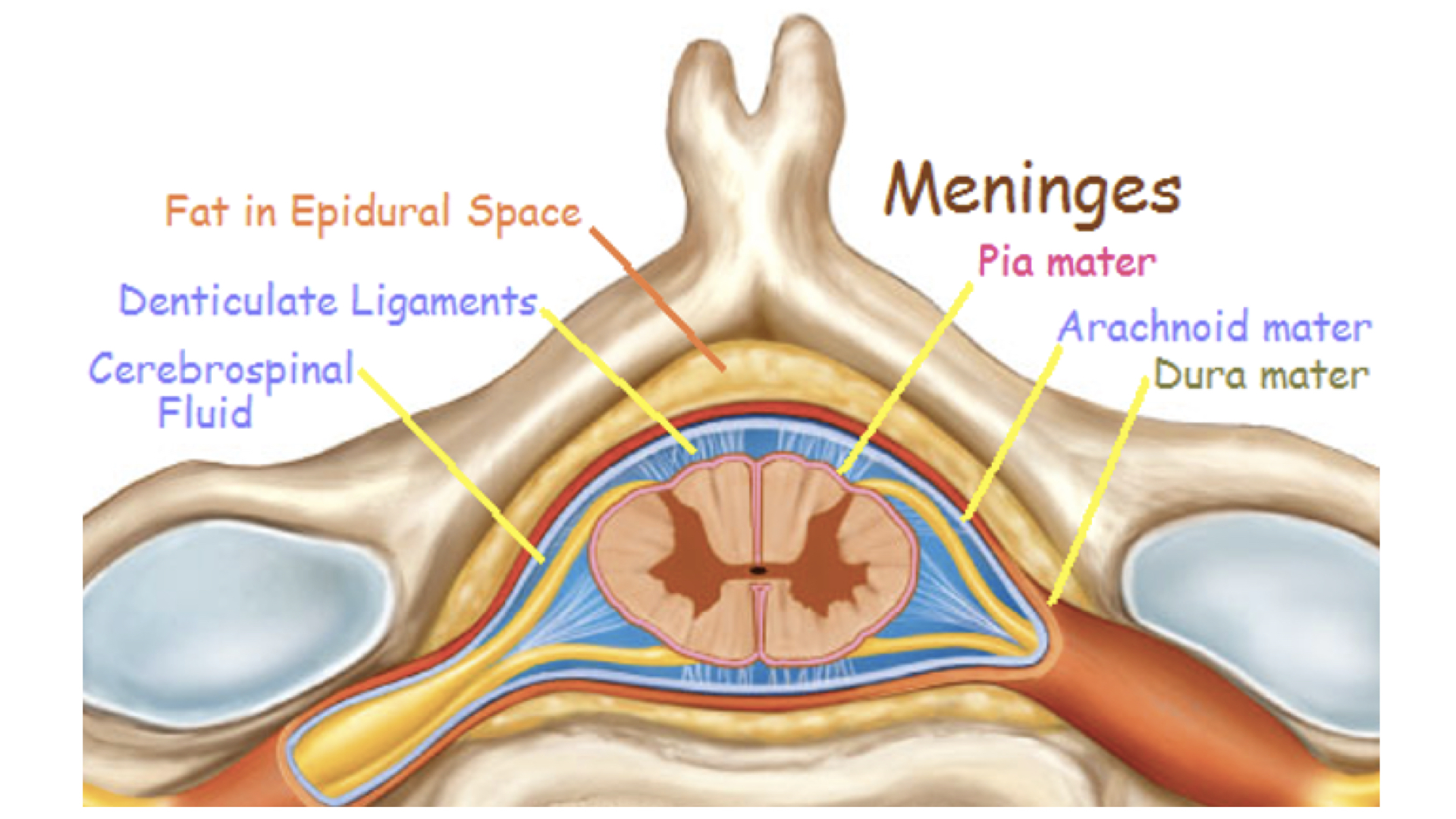 1.  epidural – between the dura mater & vertebral column, contains blood vessels,                                                                                adipose  & loose connective tissue (provides padding around cord)