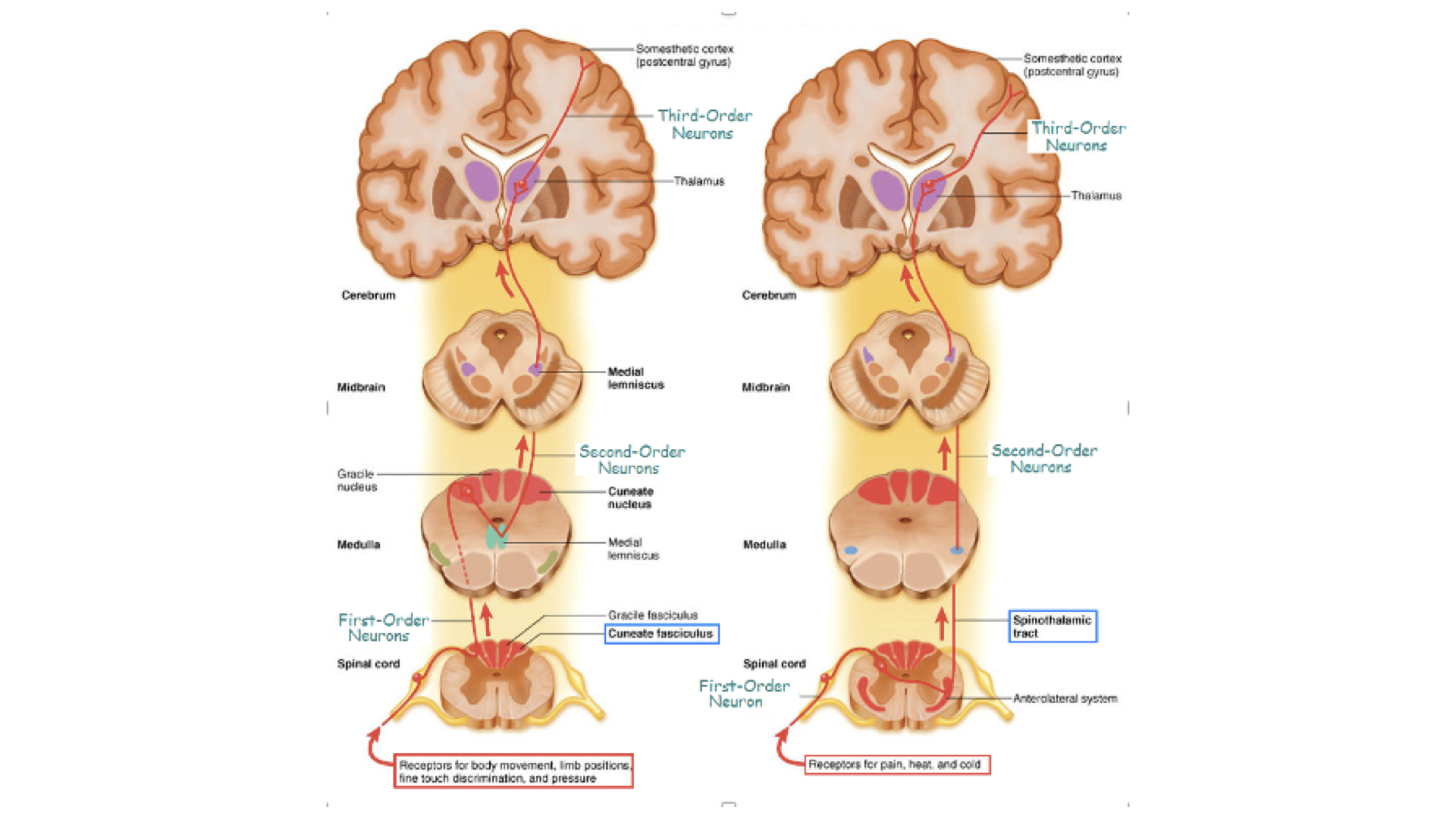 1. Ascending pathways have three neurons from sensor to cerebral cortex. Note that all go through the thalamus which serves as a filter.