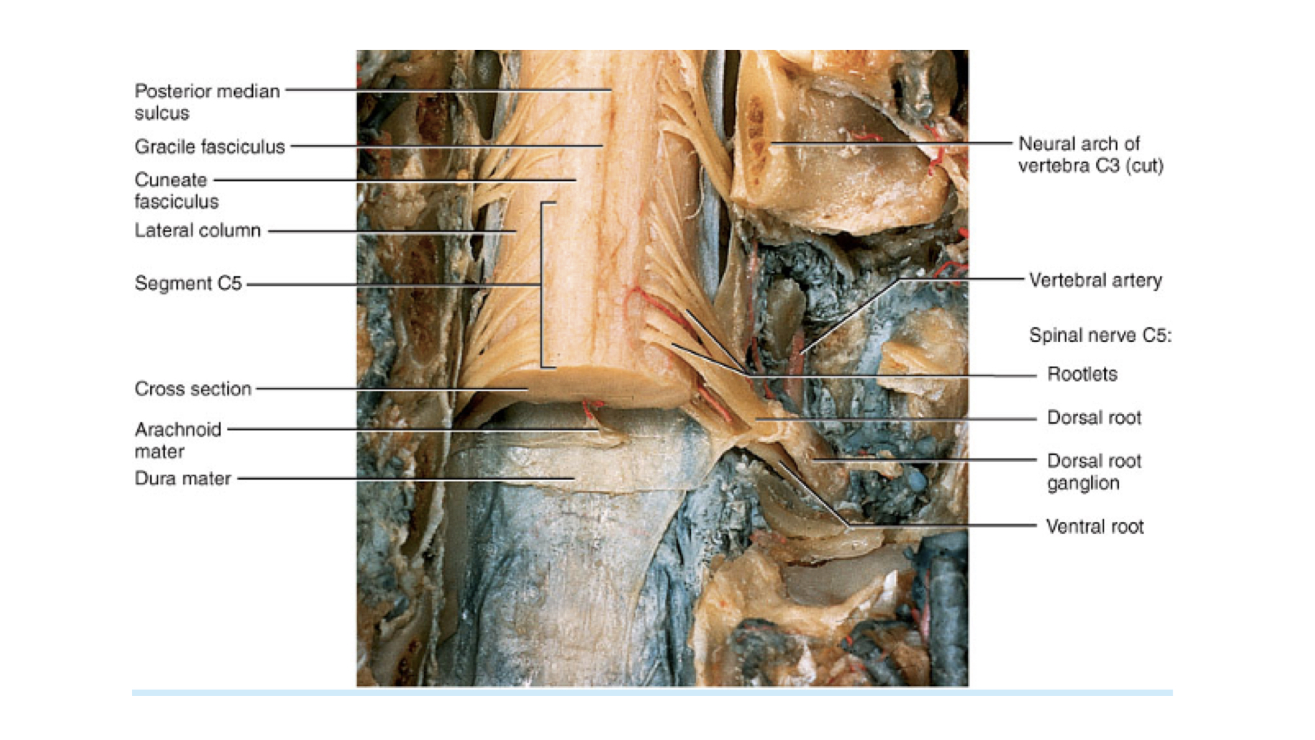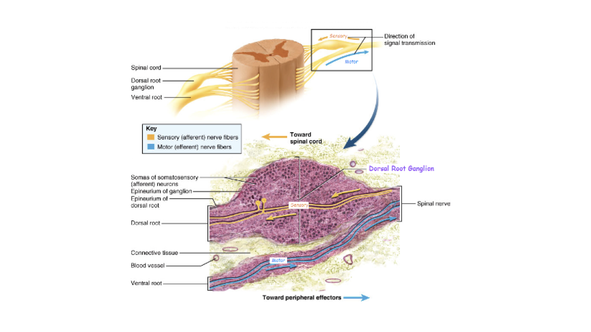 6.    dorsal roots – sensory, afferent fibers, dorsal root ganglion, structurally unipolar, neurons from the periphery