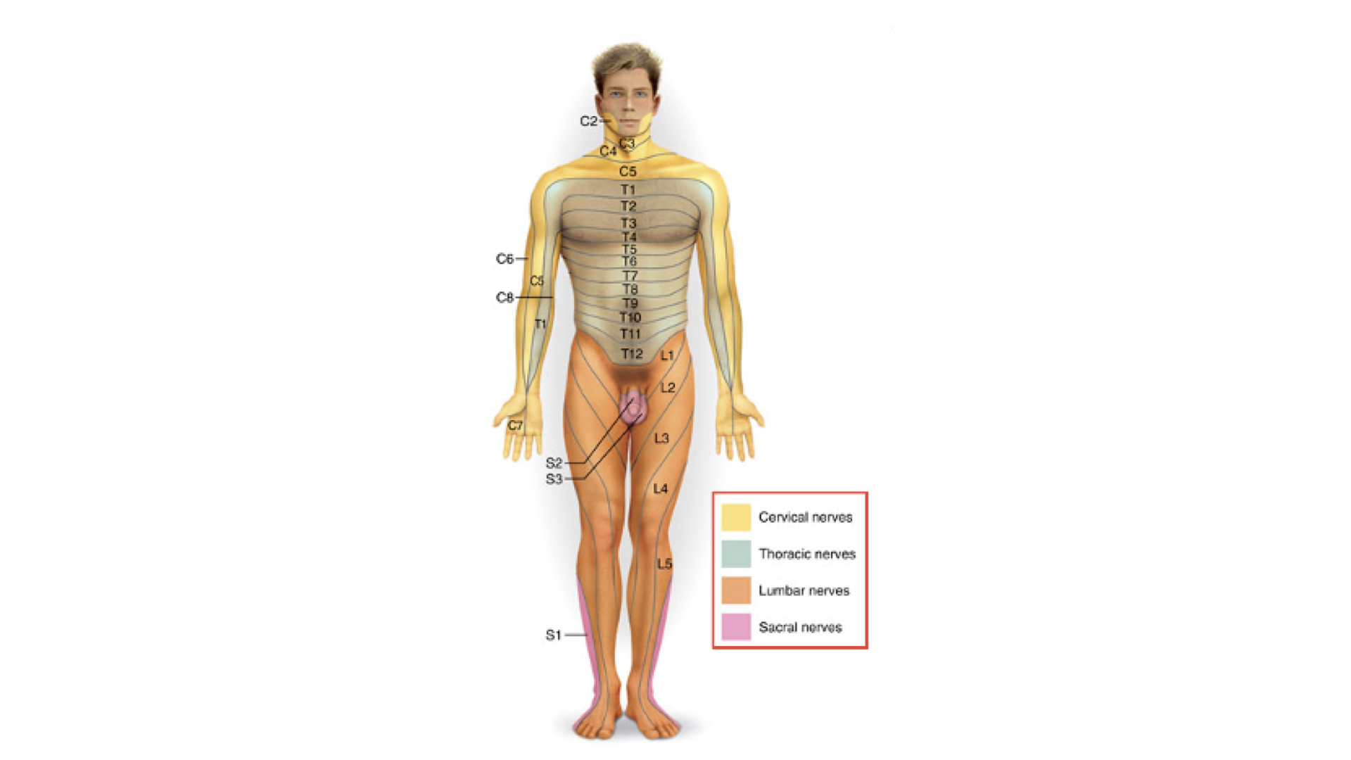 4. As mentioned above, spinal nerves innervate specific areas of the body. These areas are referred to as dermatomes. Below is a mapping of these dermatomes.