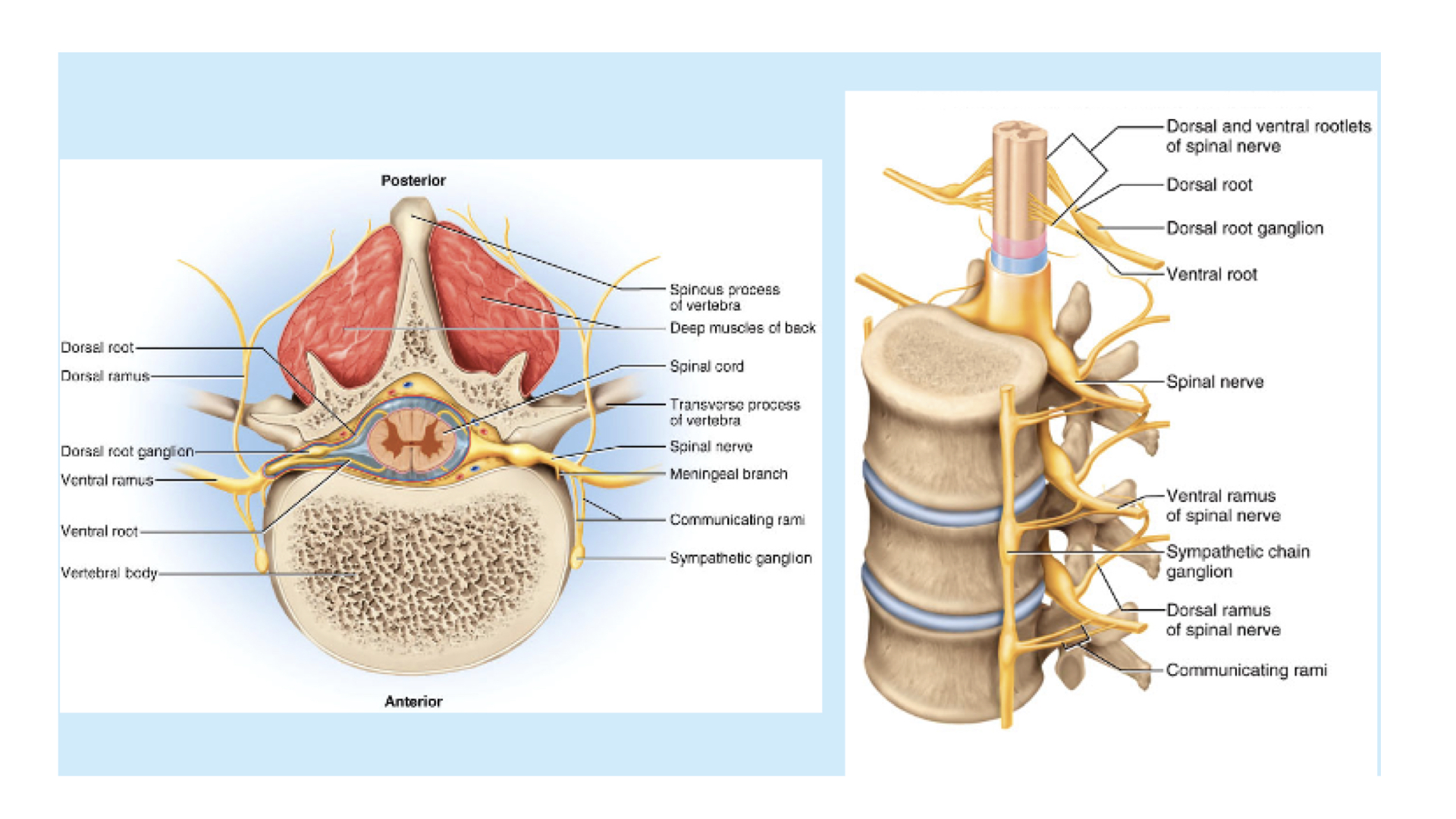 2.  After leaving the spinal cord, spinal nerves divide into dorsal, ventral, and communicating rami. The dorsal ventral simply go to those parts of the body at their respective level (recall dermatomes from the Integumentary System). The communicating rami integrate (communicate) with spinal nerves above and below the level.