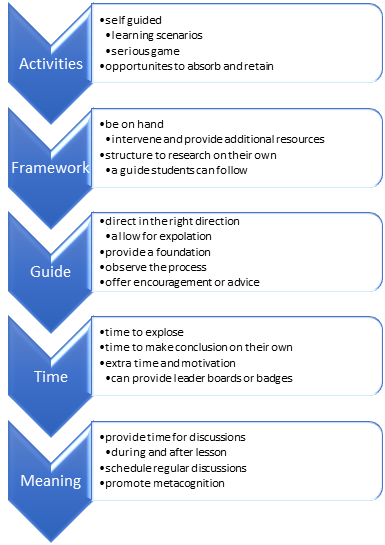 When designing with Discovery Learning, instructors should focus on five tips as indicated in figure 1. To plan for an effective course, designers should provide small amount of information over time. A strong framework is necessary to keep students from going off track. Instructors should be available to support students as needed. Content should not have strict time limits. It takes time for students to explore and discover answers on their own. Discussion is important to help inspire meaning. Once the lesson is complete, students should discuss the results with peers. This time for metacognition allows them to recognize their process and behaviors.