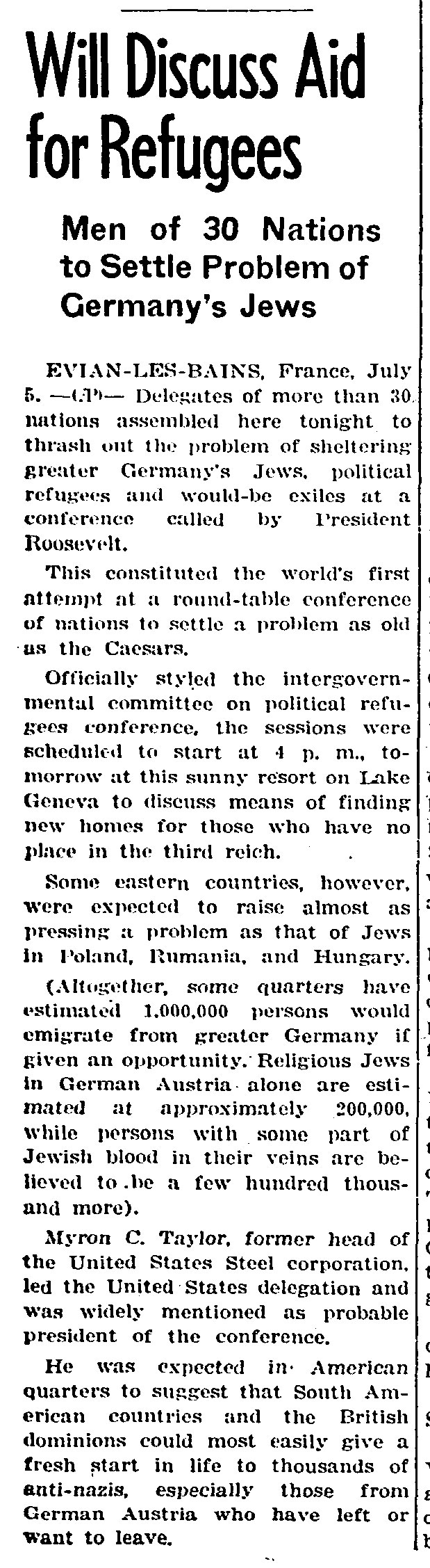 Screenshot of an article from The Daily Illini n Urban-Champaign, Illinois, provided by the United States Holocaust Memorial Museum. This article provides background information on the Evian Conference and FDR/America's role in it. Also some of the wording in the article is a sign of how some Americans portrayed the victims of the Shoah.