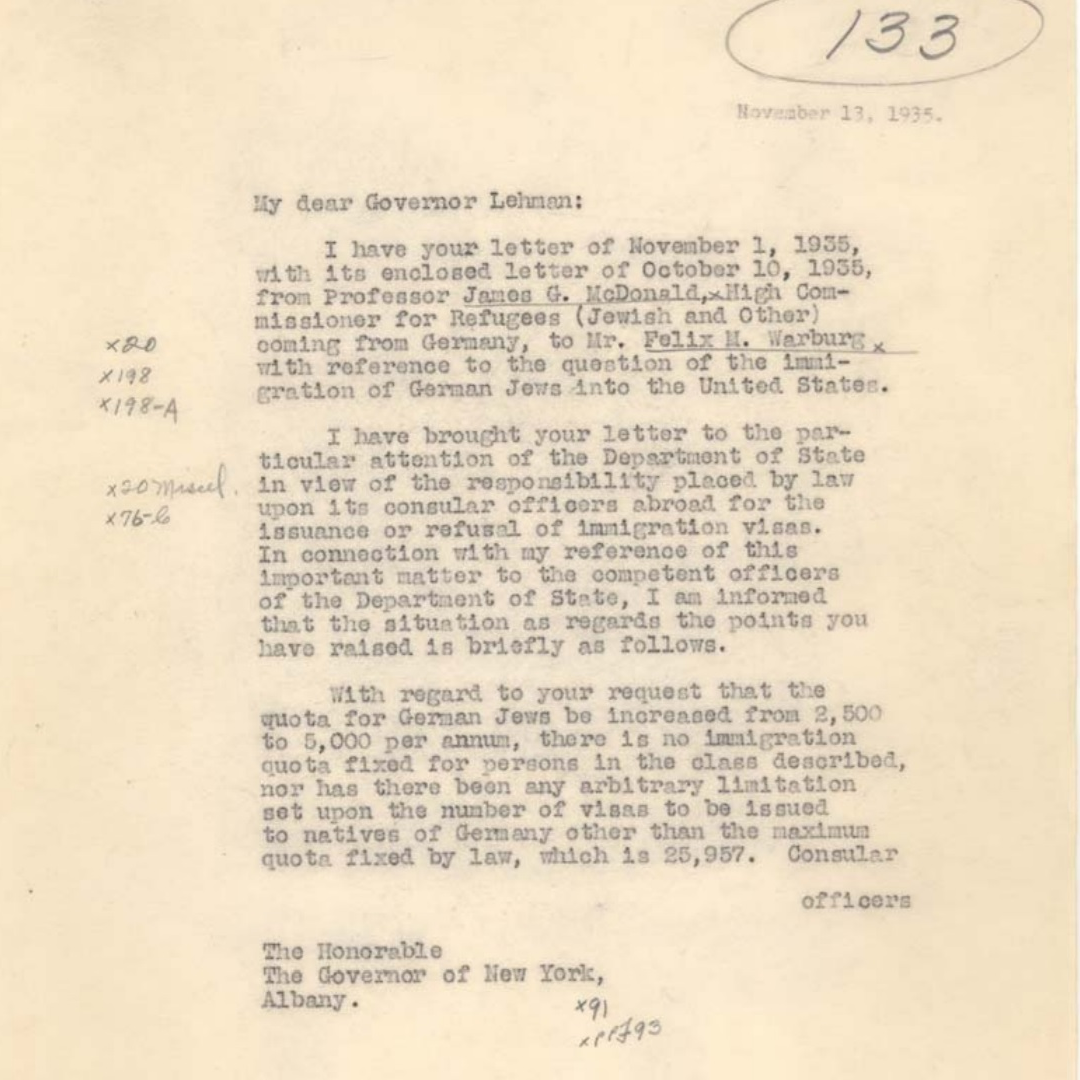 " Letter, FDR to New York Governor Herbert Lehman, November 13, 1935: Throughout the 1930s, President Roosevelt was kept informed of the growing refugee crisis in Europe by political leaders with ties to the American Jewish community, including New York Governor Herbert Lehman. Through these contacts, Roosevelt also learned that the strict immigration quotas in place at the time were not being fully or fairly administered by his own State Department. In this November 13, 1935 letter, the President advises Lehman of the results of his own examination of the visa issue, the legal limitations imposed by the Immigration Act of 1924, and his instruction to the State Department that German Jews applying for visas were to be given “the most generous and favorable treatment possible under the laws of this country. (President’s Official File 133: Immigration, 1933-35, Box 1)." Page 1/4 http://www.fdrlibrary.marist.edu/archives/pdfs/holocaust.pdf