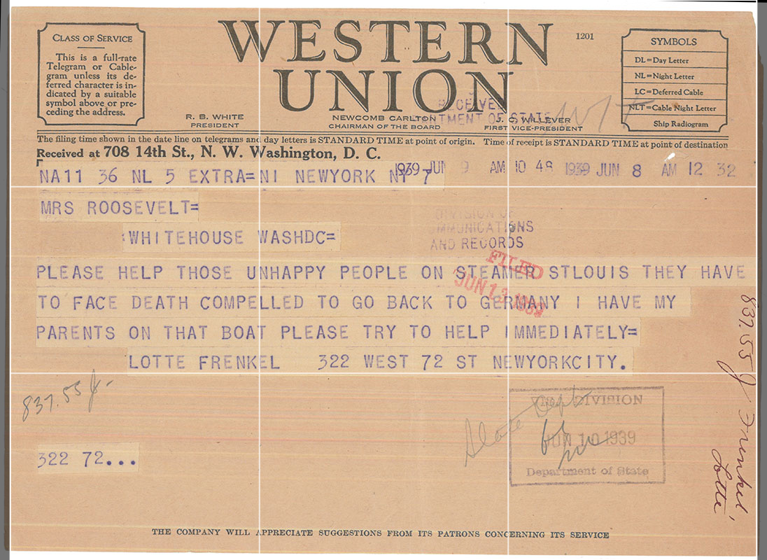 "Lotte Frenkel of New York City sent this telegram to Eleanor Roosevelt, pleading for her to do something on behalf of the St. Louis passengers." This shows FDR was well aware of the St. Louis and had an idea what would happen if they were sent back.