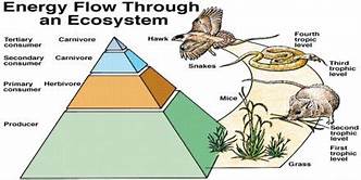 One of the basic characteristics of all life that you covered in the Introduction to Biology unit is that living things use energy. They use energy to maintain their organization (arrangement of molecules and cells) that allows them to stay alive. Since the second law of thermodynamics states that energy transformations are never 100%, some of the energy always gets "lost" as heat. "Lost" is used only in the sense that it is no longer useable by living organisms to sustain life; it is not destroyed. Instead that heat radiates back into space and is gone as far as the earth is concerned. So what does any of this have to do with ecosystems or is it just the usual ravings of some biology instructor. We get our energy by eating food--other living organisms or their products. That conversion of chemical energy in the food molecules to ATP by our mitochondria is a series of enrage transformations. Some energy is lost at every step; consequently we don't have the option to not eat. This section examines that flow of energy through the ecosystem and how it works. To start, then, we need to trace the energy from source (the sun) through living organisms--in other words, the trophic structure. Trophic structure is the delineation of who eats who in an ecosystem; feeding is how the energy moves between the levels described below.