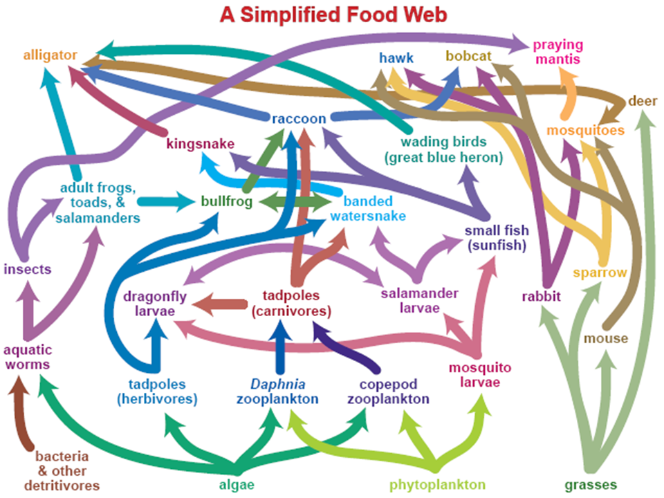 Reality, of course, is always more complex than a straight line food chain. Insects may feed on many different plants. Birds eat a variety of insects or seeds. A much better depiction is a food web. A food web shows "all" of the feeding relationships within an ecosystem. Rarely do we know every organism in an ecosystem let alone every feeding connection. But, even a partial representation is better than a food chain.