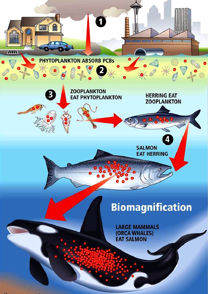 One of the consequences of trophic structures is that materials composing organisms are passed to the organism of the next trophic level. If the chemical, like DDT, can't be metabolized, it accumulates in that organism. When it is preyed upon, the accumulated chemical passes to the next level. Even though the amount in any organism may be small, when you keep adding more and more small amounts, it becomes (magnified) more concentrated and can become toxic.