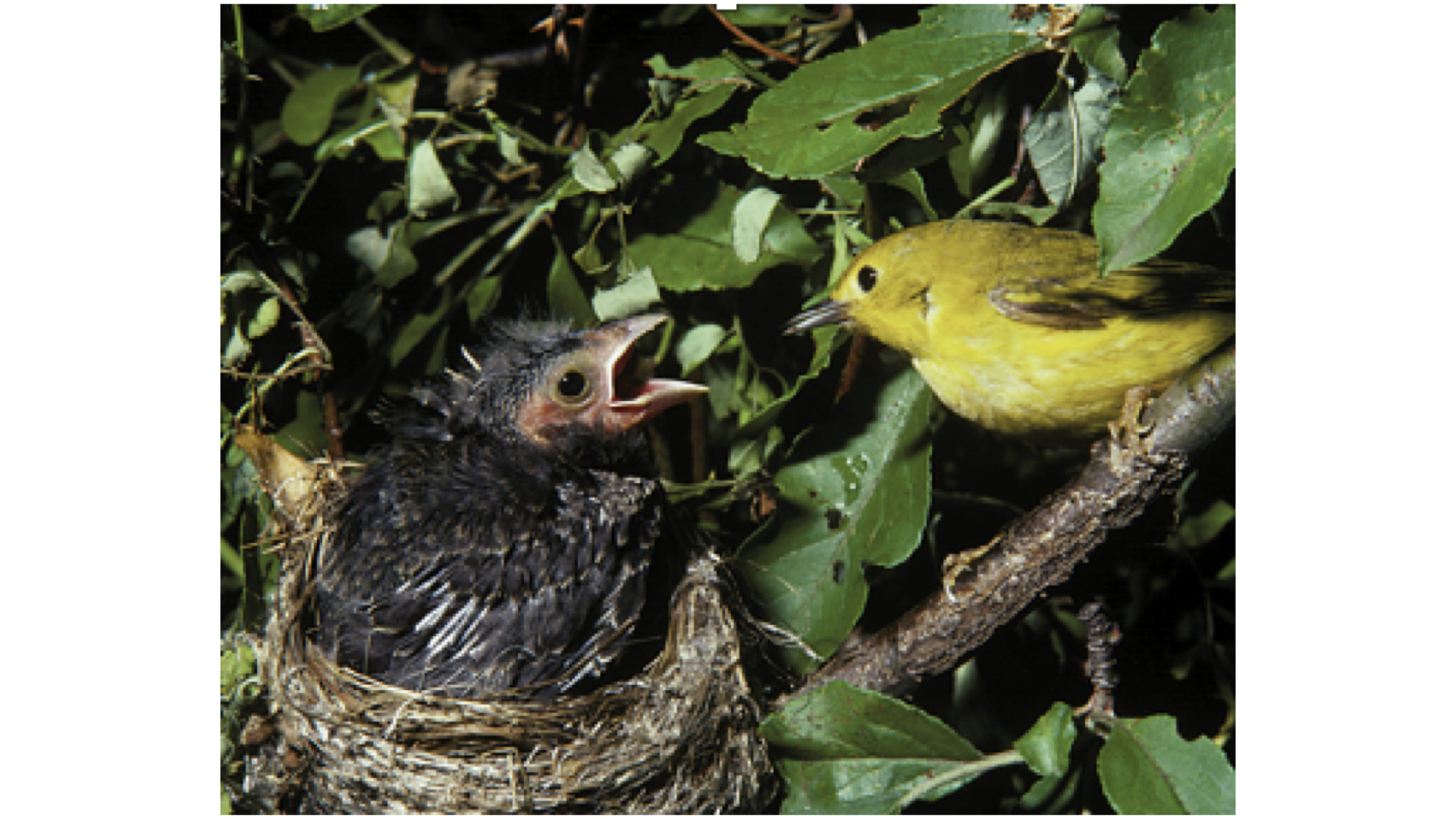 Cow bird nestling has pushed host bird nestlings out of nest. They continue to feed the gaping mouth--it is an innate behavior.