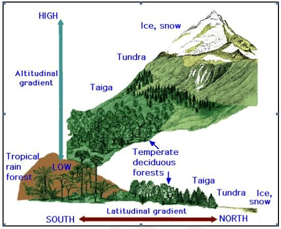 Please read in your text any information plant and animal zonation on mountains. We have seen that moving north or south on the earth's surface one may pass through a series of different biomes. The same thing is true if one moves vertically up the slopes of tall mountains. Climatic conditions change with altitude and the biotic communities change correspondingly. In very high mountains the following zones can be identified: