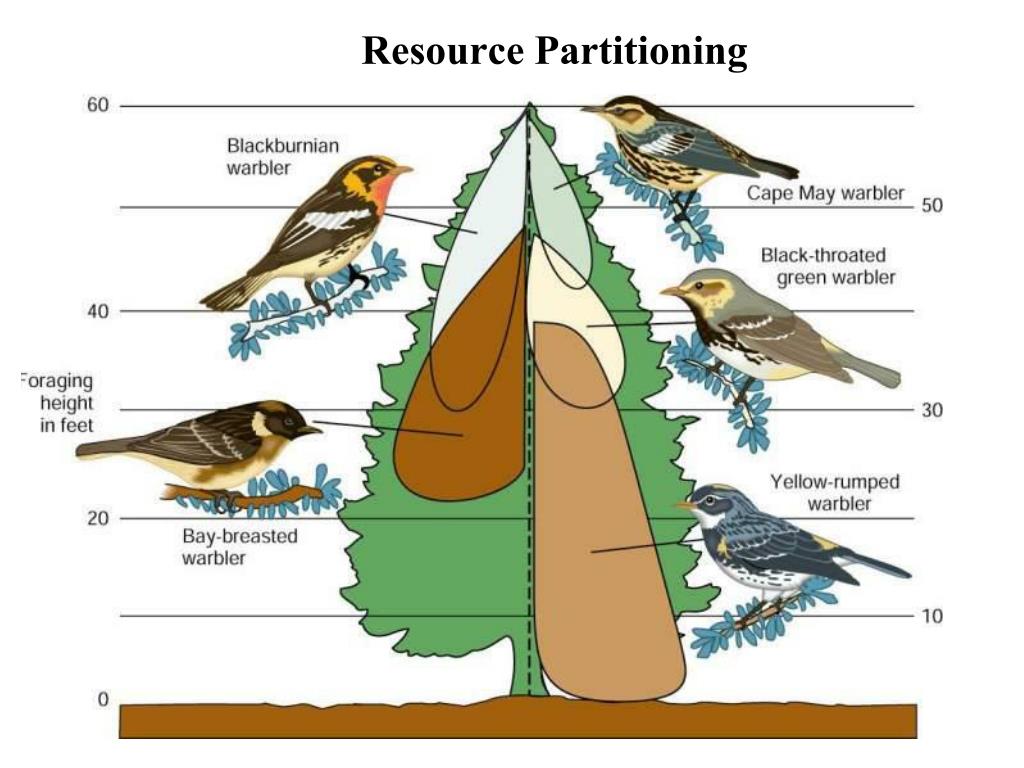 Similar resources may be subdivided in a way that allows competing species to coexist. In resource partitioning organisms can share required resources in different way or at different times, which allows them to coexist with competitive exclusion principles kicking in.