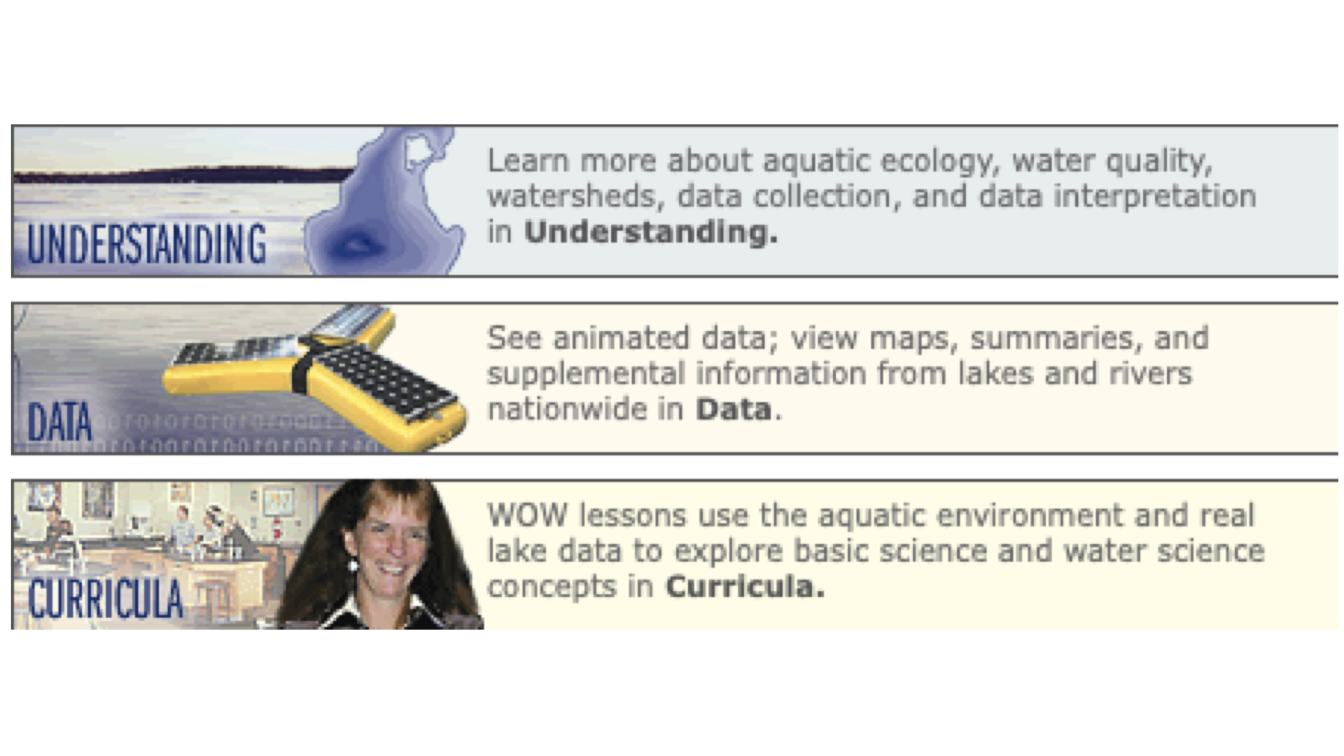 An excellent resource on Lake Ecology is Water on the Web, a set of basic information plus datasets that can be used for assignments. There is a description of an assignment available here.