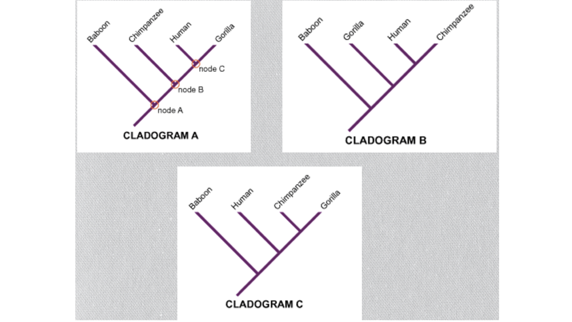 As an example, above are four species and three different ways of arranging their evolutionary relationships. Based strictly on appearance, it is not immediately obvious which of these are correct. With today's molecular data, we know that option B is more correct than the other two. This process gives us an approximate tree diagram as shown below: