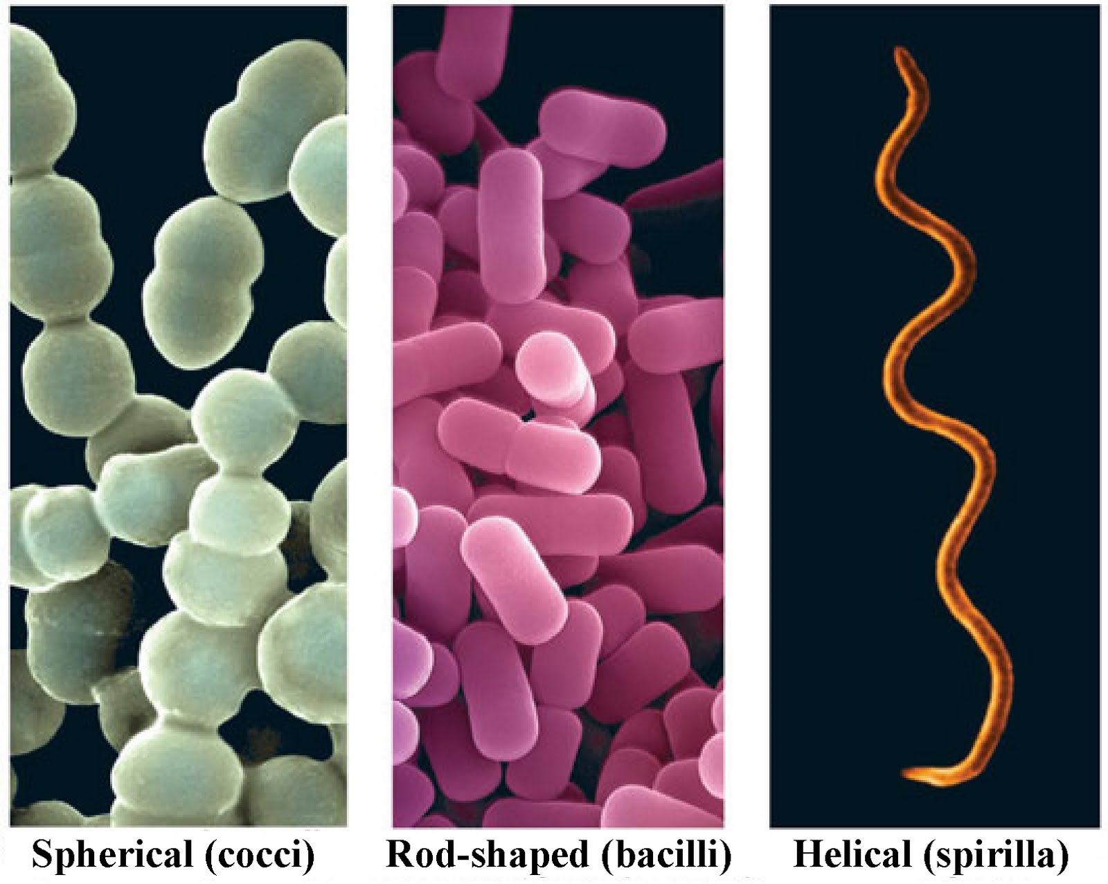 3. Most bacterial cells have one of three shapes—a bacillus (rod-shaped), a coccus (ball-shaped), or a spirochaete (corkscrew-shaped).
