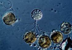 The representatives of the ancestral groups are the Chytrids and the Microsporidians. They are all intracellular parasites and produce flagellated spores. Spores in other groups are not flagellated.