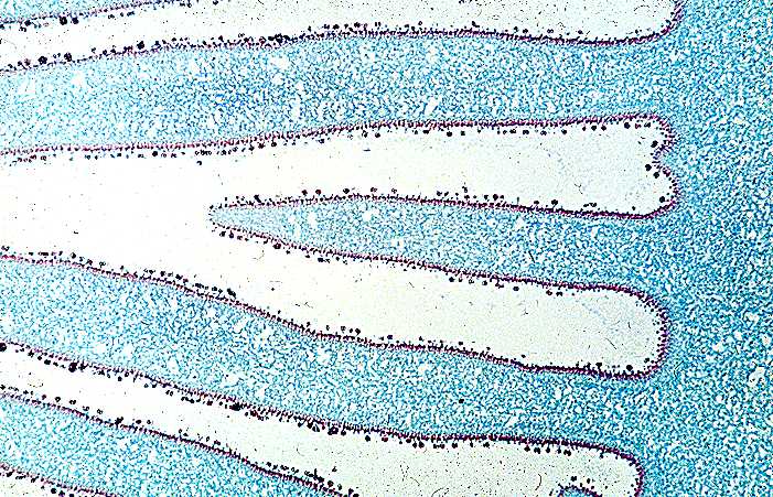 Coprinus gills - dark spots are basidia with spores