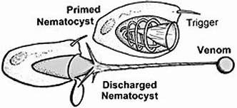 All organisms beyond sponges have symmetry. Cnidarians are the only phylum with radial symmetry. Imagine a pie-lets say cherry. If you cut it in half you get two identical half circles. It doesn't matter what direction you cut, you get mirror images.The Cnidarians are all marine or aquatic and not active swimmers. the circular symmetry allows the them to sense the environment in all directions. They have only one opening into a gastrovascular cavity--serves to digest and distribute nutrients. This is referred to as a "sac-like" digestive system.Since these organisms have no organ systems, they have only two tissue layers--an outer ectoderm and an inner endure lining the gastrovascular cavity. Surrounding the mouth are tentacles usually equipped with stinging cells called nematocysts. These little "harpoons" contain toxins which stun or kill the prey. Since they are activated by a simple trigger mechanism, they can still sting when the animal has died. Be careful handing beached jellyfish, especially the beautiful Portuguese Man of War.
