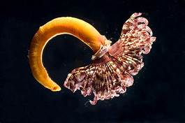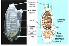 Subphylum Urochordata:  The Urochordata are far removed from the typical vertebrates. They are referred to as tunicates and the adult form is a sessile filter feeder with only pharyngeal gill slits as a chordate characteristic. However, the larvae exhibit all four characteristics. They draw water in through one siphon. It passes through the gill slits where food particles are trapped in mucous. The water then exits through another siphon. some members are colonial and drift in the water column--they are called salps. With warming of antarctic waters these animals are more common and krill populations declining. This change is impacting the food web greatly as sales contain far less nutrition than krill.