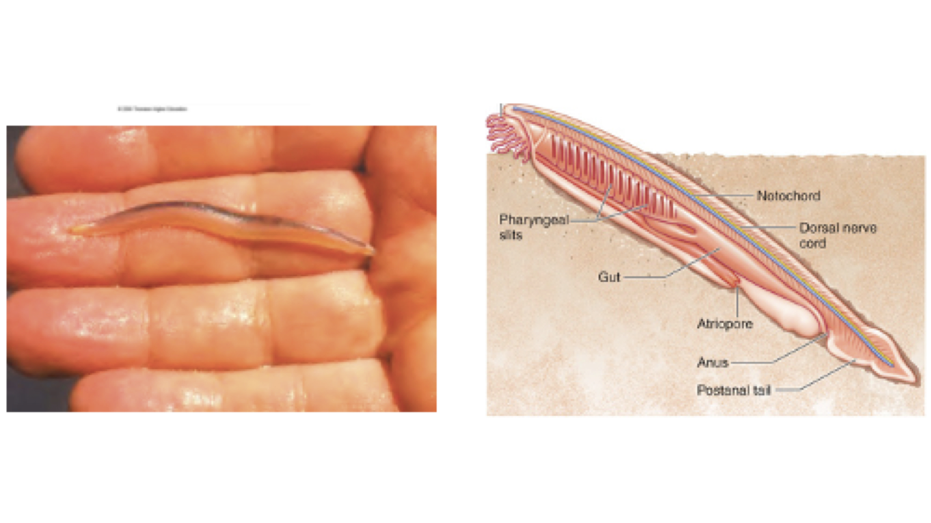Subphylum Cephalochordata:  The cephalochordates are small bottom filter feeders that are referred to as lancelets or Amphioxus.  Found in shallow tropical waters , they exhibit all four chordate characteristics.
