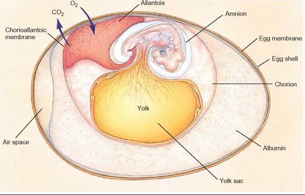 Class Reptilia: Reptiles made a complete break from the open water requirement for life and especially reproduction. With their scaly skin to prevent water loss and legs strong enough to walk on land without the buoyancy of water, they spread across the relatively unpopulated land masses. But their major advance was the development of the amniote egg. The embryo develops in a water filled membrane inside the shelled egg with yolk for nutrients. These eggs could be laid on land and the embryo still has the protection of the water environment. Since the shell was built while still inside the female reproductive tract, fertilization had occur internally. This led to a wide variety of physical and behavioral adaptations.