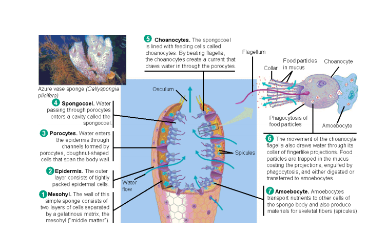 Starting up the evolutionary tree the first characteristic is to determine if the organism has true tissues. Tissues would be similar appearing cells that work as a group to perform some activity. The only animal phylum without true tissues are the sponges. An excellent description of this phylum and how they function is found at the University of California Paleontological Museum (UCMP) at Berkeley. Be sure to look at the additional links given in the site. Sponges are filter feeders that pull water in and then out an excurrent opening. Small bits of food are captured by the collar cells (choanocytes).