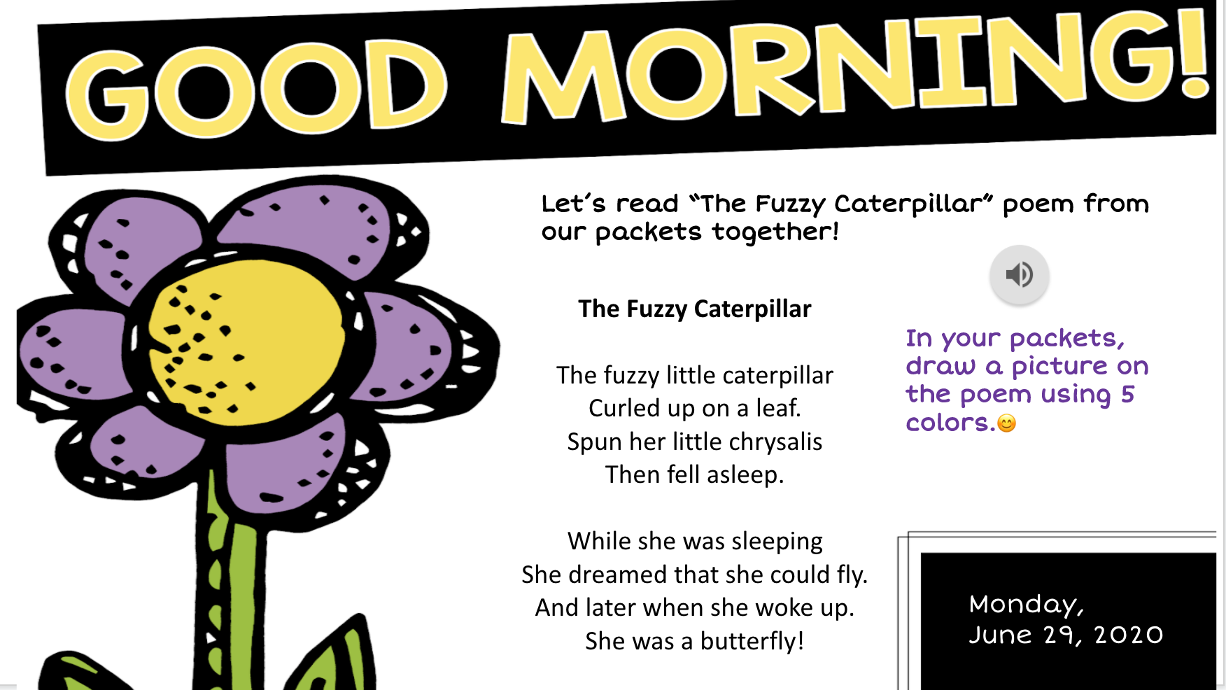 This lesson reviews the "Make a Prediction!" writing assignment and asks for students to reference the Writing Checklist before submitting their work. A link to listen to a reading of The Very Impatient Caterpillar is included.