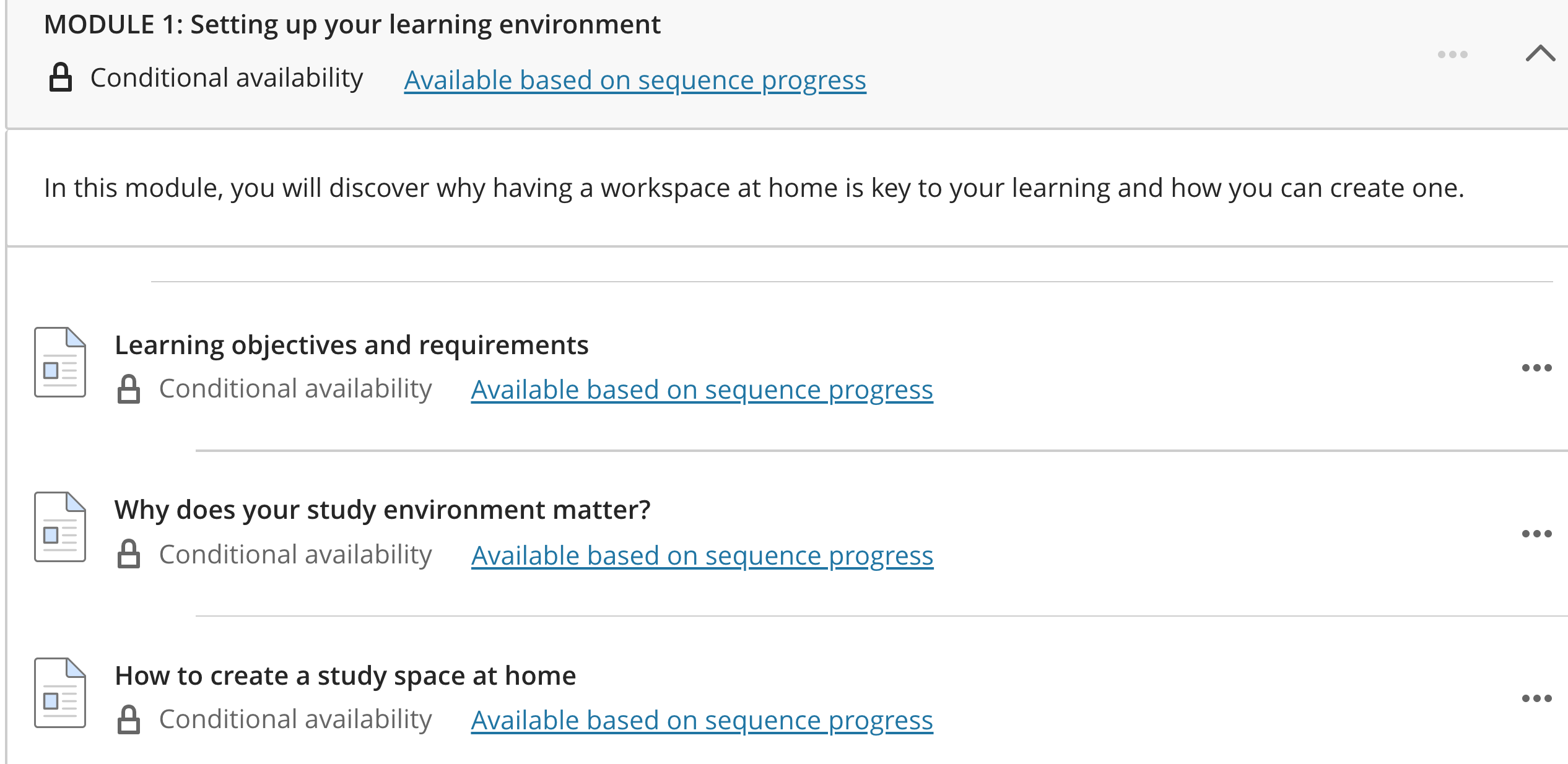 Screenshot of the "Learning at a distance" course for incoming studentsModeled after the Learning Online 101 course offered by CSUCI, our course, almost entirely developed for students for the students, focuses on providing incoming students with strategies for success in the new learning environments.