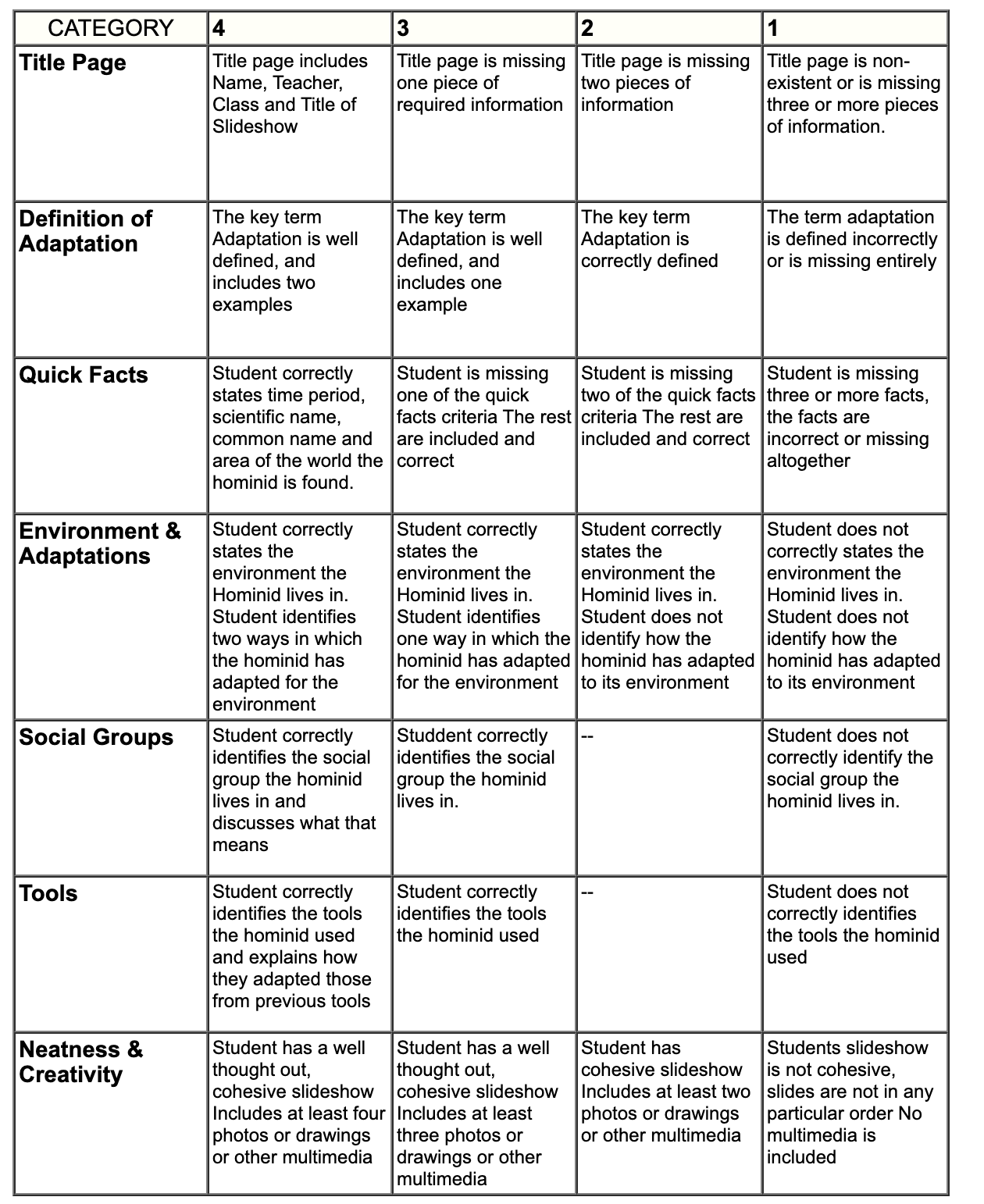 Hominid Slideshow Rubric