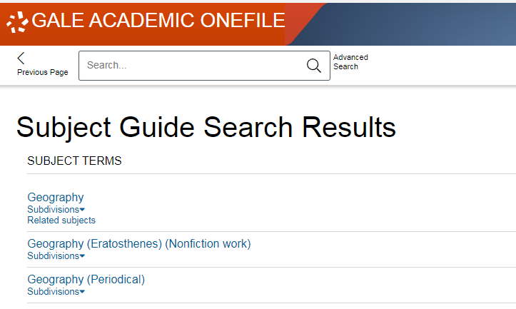 Subject search screen shot showing a geography search, with subdivisions and related subjects.