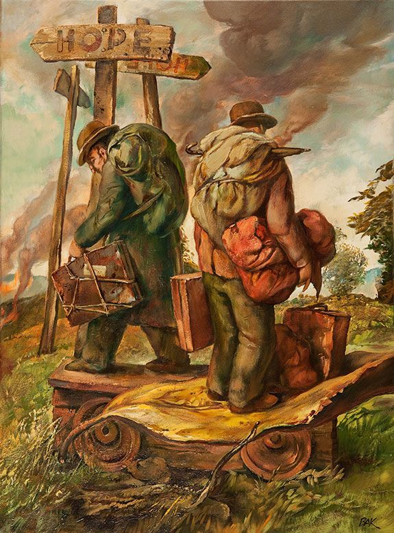 As a direct witness to the one of the most horrifying aspect of the Shoah, the gassing of massive groups of people, David Olère tends to insert himself into his own paintings as a sort of self portrait. Here we see a recreation of a radical act of resistance that Olère participated in. After those imprisoned and chosen for gassing undressed and entered the chamber, he went through the belongings of those who perished to gather the food they had brought with them in order to throw it over the fence to other sections of the camp for others to eat. Along with the violence and death of the Shoah, there was rarely visual documentation of the acts of resistance that Jewish prisoners used to fight for survival. This is the most striking theme in Olère's work, that he was able to document the moments that would otherwise have been long lost and forgotten. In this way, his work directly affects the memory of the events of the Shoah, providing a record of the parts that would otherwise have perished at the hands of the Nazi's. In the foreground of the painting we also see a small doll, giving us a symbol for the range of lives lost in the gassing. This method of genocide affected everyone, no matter what age group or gender they belonged to. Including this in the painting both assists Olère with at the least, processing these memories, and at the most, ridding himself of having to return to it over and over. For the viewer of the art, it is a stark reminder of the far reaches of the violence of the Shoah. In the background of the painting we have another symbol, perhaps on a more spiritually optimistic note. The cart of bodies being walked away towards a building in the background is being illuminated by a beam of light that is cutting through the clouds. This seems to be included in the painting as a reminder to those viewing it that even when death and violence was the core of the Shoah, those that perished should be the centered focus of the events. The light being cast on to the bodies brings our attention to them in the painting, as it should always be brought to outside of the painting. In attempting to understand the Shoah, those that were the victims or survivors should always be centered, and not the narratives of those that enacted the violence.