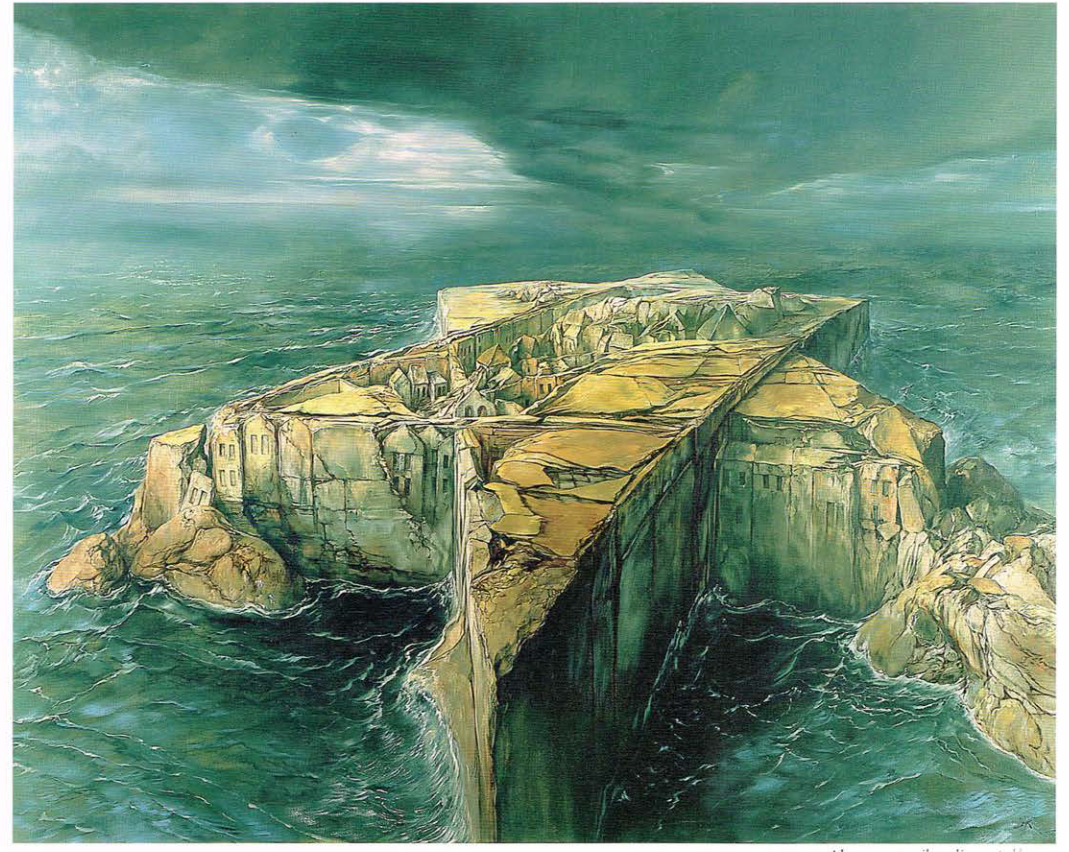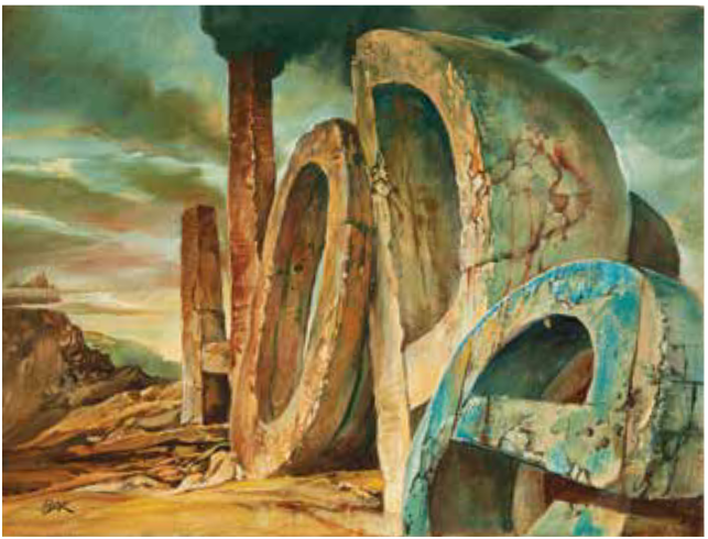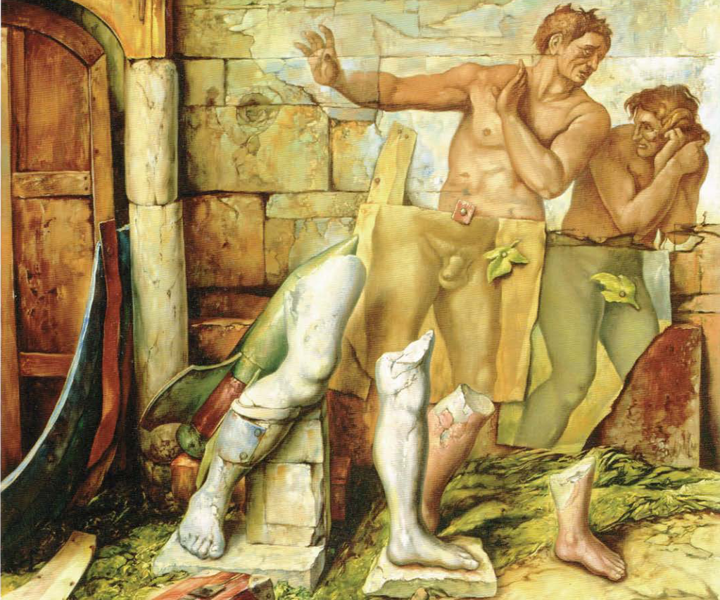 Samuel Bak's visual language is composed of many different symbols, but a distinct style of the contrast between a "destroyed world" and "rebuilding" a world (Bak 2017). The composition being based off of the idea of "reconstruction" is the central theme in Bak's art that is seen in other artists work as well. Rebuilding after such a horrific event such as the Shoah is a common theme among Shoah Art, with "total reconstruction" not being possible. Therefore we see a very fragmented rebuilding of a world in Samuel Bak's work. It calls into question whether it is being rebuilt, or torn down. The position of the work is between destruction and reconstruction, with neither being clearly represented or "possible", as Bak says.