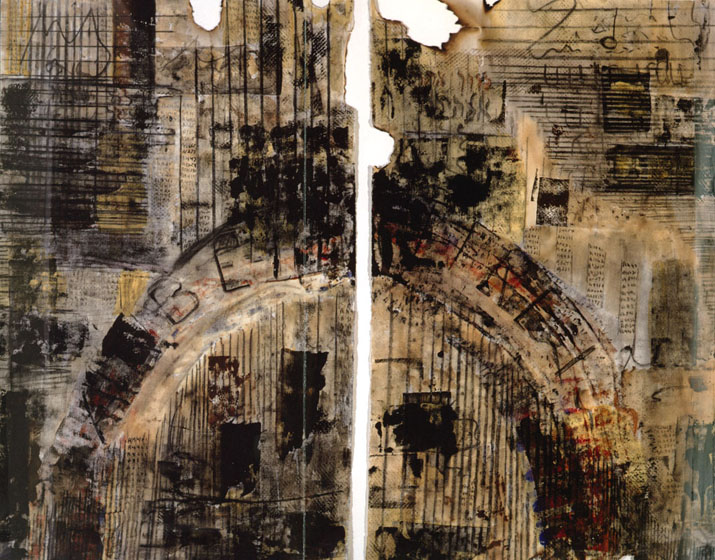 Utilizing this famous image in his own visual metaphor is Bak's way of bringing factual/photographic testimony of the Shoah to his art, and intertwining it with his own experience as well. The reconstruction of something that was there before using the debris of the city and every day objects is a symbol that Bak uses throughout his work. A viewer gets the sense of the boy through the negative space, and the attempt to make his image from the rubble of the city scape is a metaphor for the attempts to create a life after the Shoah. He is not wholly recreated, as seen with the negative space, but an outline of him remains. The question asked continually through Bak's work is whether this reconstruction is possible after such an event. He is simultaneously attempting to do this for himself through the work, and also causing the viewer to ask the same question. If it was possible, I think Bak would have simply painted a portrait, but the way he is portraying the boy through the negative space of the crumbling city around him evokes questions of the possibility of recreation or reconstruction after the Shoah.
