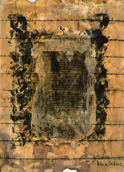 Lamentations is one of the most poignant pieces I have come across from Cahana's body of work. Slightly less abstract than her other work, we get a a more pressing sense of the mission that Cahana has given herself. As art historian Barbara Rose wrote in regards to Cahana and her work, she is "Determined to overcome the contradiction between aesthetics and mass murder, two irreconcilable opposites representing the highest and lowest levels of human consciousness" (Rose 1986). In attempting to translate the experiences she went through in Auschwitz, this piece shows us a page from the Torah, the Jewish holy book, behind a wall of barbed wire. The immediate symbology of containing a page from the holy book of the Jewish faith behind a barbed wire fence is seen, and the viewer feels more aligned with not only the humanistic experience of being imprisoned, but the cultural effect of the Shoah as well. The destruction sought by the Nazi regime was not just based in imprisoning and killing the humans that they persecuted, but destroying the culture altogether. The book burnings of the Shoah were an early sign of what was to come, and the destruction of the Jewish culture was second only to the destruction of its people. Cahana's art seeks to represent this here. It also works as a medium to translate her own personal experience of being imprisoned. When viewing this piece, we get a constricted feeling, like if we wanted to reach out and touch the page of the Torah, we couldn't. Reaching the absolute understanding of what it meant to be in Auschwitz is in this same vein. Unless we were there, we cannot truly understand the incomprehensible horror, but the aim of the piece alone is not to translate this. It is to give us a "glimpse of the story" (Cahana), and alongside other pieces from survivors, whether it is firsthand accounts or more abstract representations such as this, we can hopefully achieve a level of understanding and empathy that honors those that went through this experience themselves.