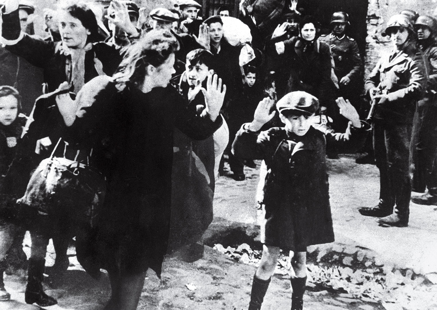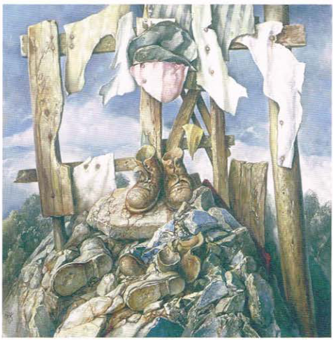 The visual language and metaphors used by Samuel Bak are some of the most striking symbols I have come across in the Art of the Shoah. In this famous piece Absence (Bak 1997), we see a method of Bak's art that we see throughout his pieces, the use of negative space to evoke a sense that something is there, but not in the whole sense. The image appropriated here is of a famous picture of a boy surrendering in the Warsaw Ghetto (pictured below).