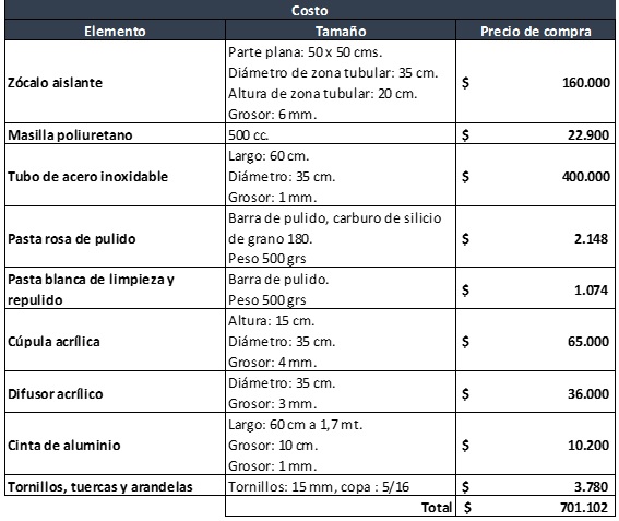 Los costos de materia prima por unidad de producción se reducen en un 62,68%, en comparación a la compra de material ya fabricado. Estos serían los costos de materia prima trabajando con la materia prima en bruto para la fabricación de un sistema tubular de iluminación solar: