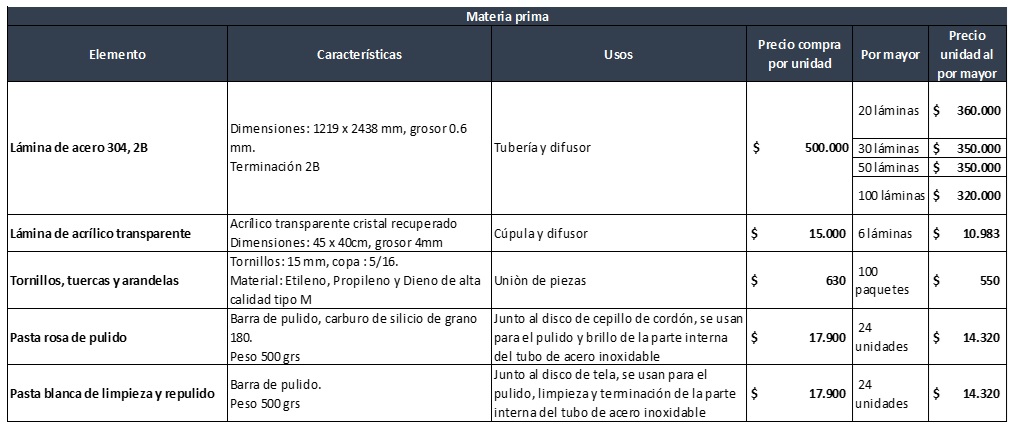 Avanzado el proyecto y una vez obtenidas las maquinas y demás elementos de trabajo se puede iniciar con la compra de materiales al por mayor, con el propósito de fabricarlos y disminuir significativamente los costos de producción. A continuación, los costos de materia prima en bruto: