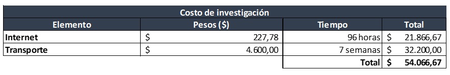 En el trascurso de la investigación se evidencia gastos como la búsqueda de artículos científicos y textos en internet y el gasto de trasporte en la búsqueda de los materiales de trabajo.