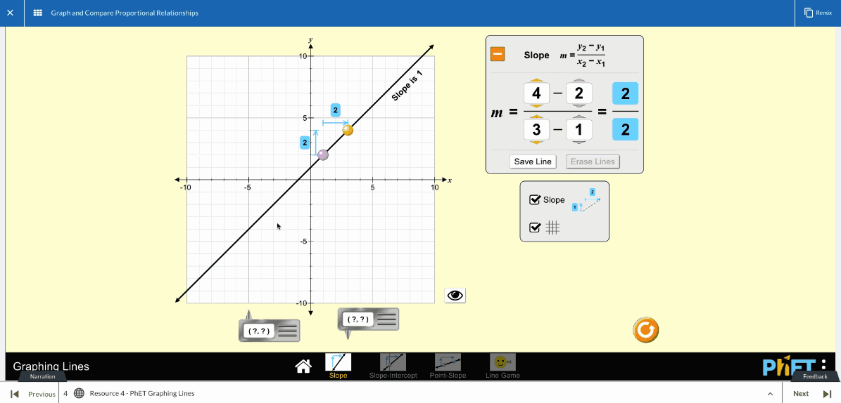 An interactive resource in Math Navigator which allows students to graph and compare proportional relationships.