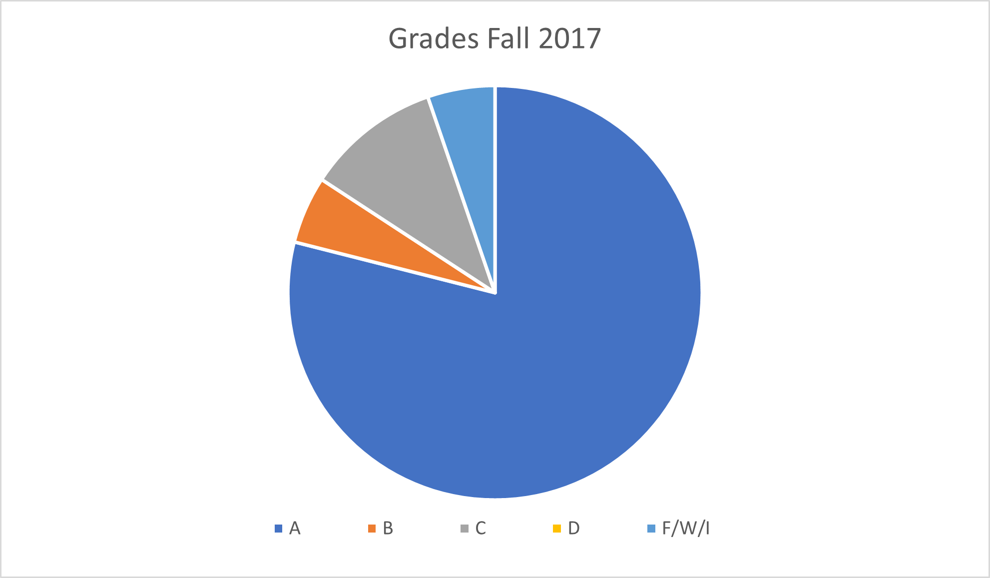 See the grades for Fall 2017, 20 students (A refers to A and A-, and same with the rest; F/W/I refers to F, mainly because students stopped doing the assignments, withdraw or asked for an incomplete):