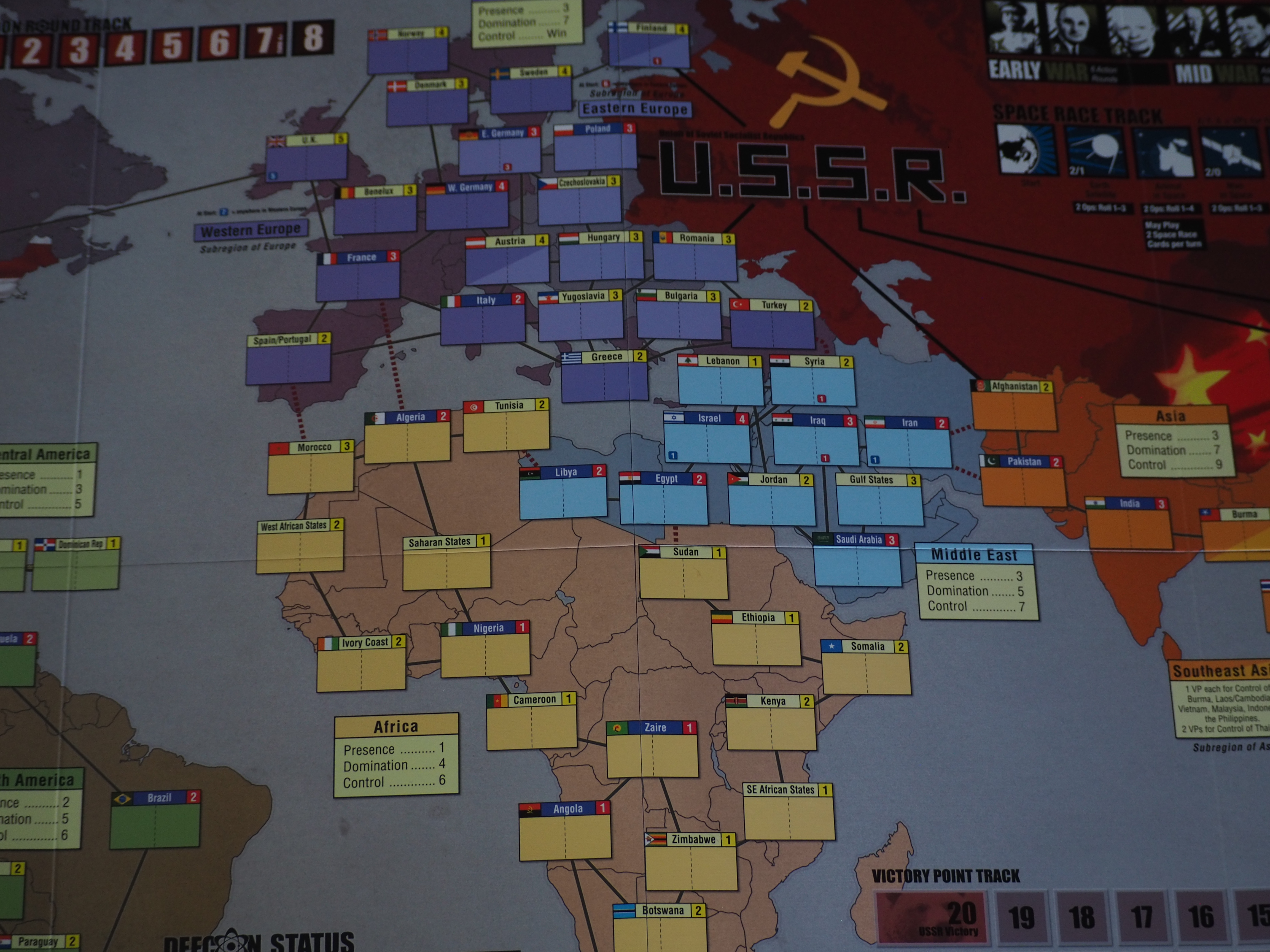 Twilight Struggle does a neat job of modelling the battle of ideas that played-out between 1945 and 1989. To win the game, players need to promote their own ideology across the globe. This can be achieved by playing the aforementioned event cards, or by assigning the point value of event cards to one of four Operations. Players could spend these resources to increase influence, reduce enemy influence, invest in the space-race, or attempt a coup event in a country. This mechanism models the Cold War rather well, as clearly direct conflict with the opposite superpower was likely unproductive due to the presence of nuclear weapons.