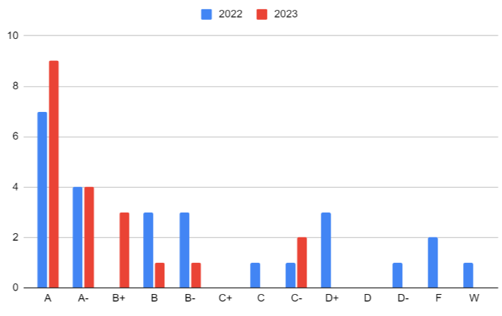 Comparing the Spring 2023 semester with the previous semester in 2022 indicates a 29% increase in A grades along with an increase in B+. These come from a reduction in B-D grade ranges. Most noticeably is a reduction in the amount of DFW with none appearing in 2023 compared to 7 in 2022.