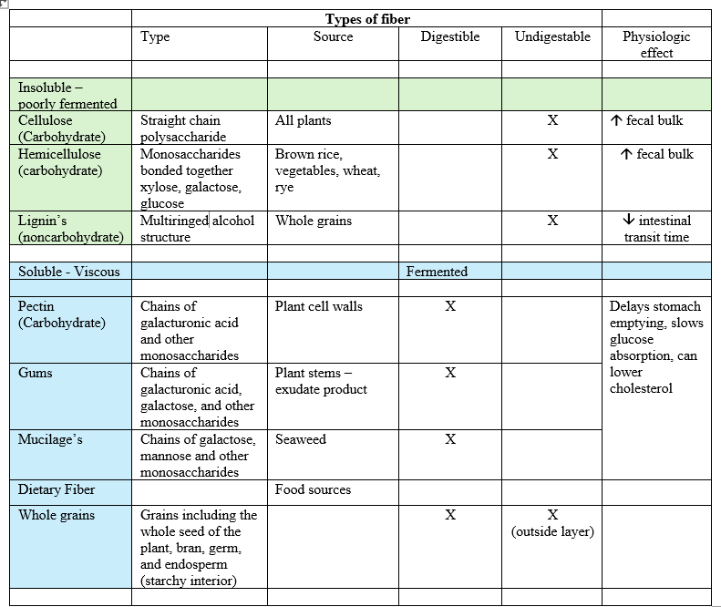 Fiber (Table 5) is considered a “non-starch” and is a class of carbohydrates known as polysaccharides. These substances while having individual sugar units, cannot be digested by the enzymes (Table 5.1) in the human GI track. Because of this structuring, the sugars associated with the “fiber” are not able to be absorbed through the small intestine into the general circulation.