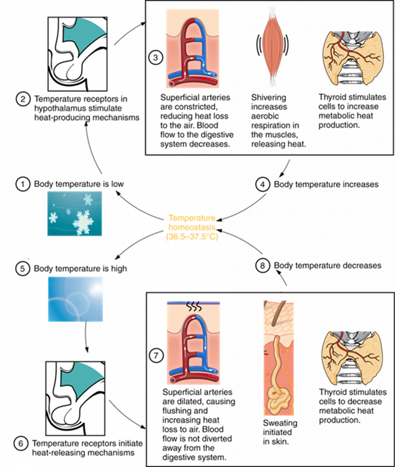 “Activation of the brain’s heat-gain center by exposure to cold reduces blood flow to the skin, and blood returning from the limbs is diverted into a network of deep veins (Figure 4). This arrangement traps heat closer to the body core, restricts heat loss, and increases blood pressure. If heat loss is severe, the brain triggers an increase in random signals to skeletal muscles, causing them to contract and produces shivering. The muscle contractions of shivering release heat while using ATP. The brain also triggers the thyroid gland in the endocrine system to release thyroid hormone, which increases metabolic activity and heat production in cells throughout the body” (Haen-Whitmer, 2021).